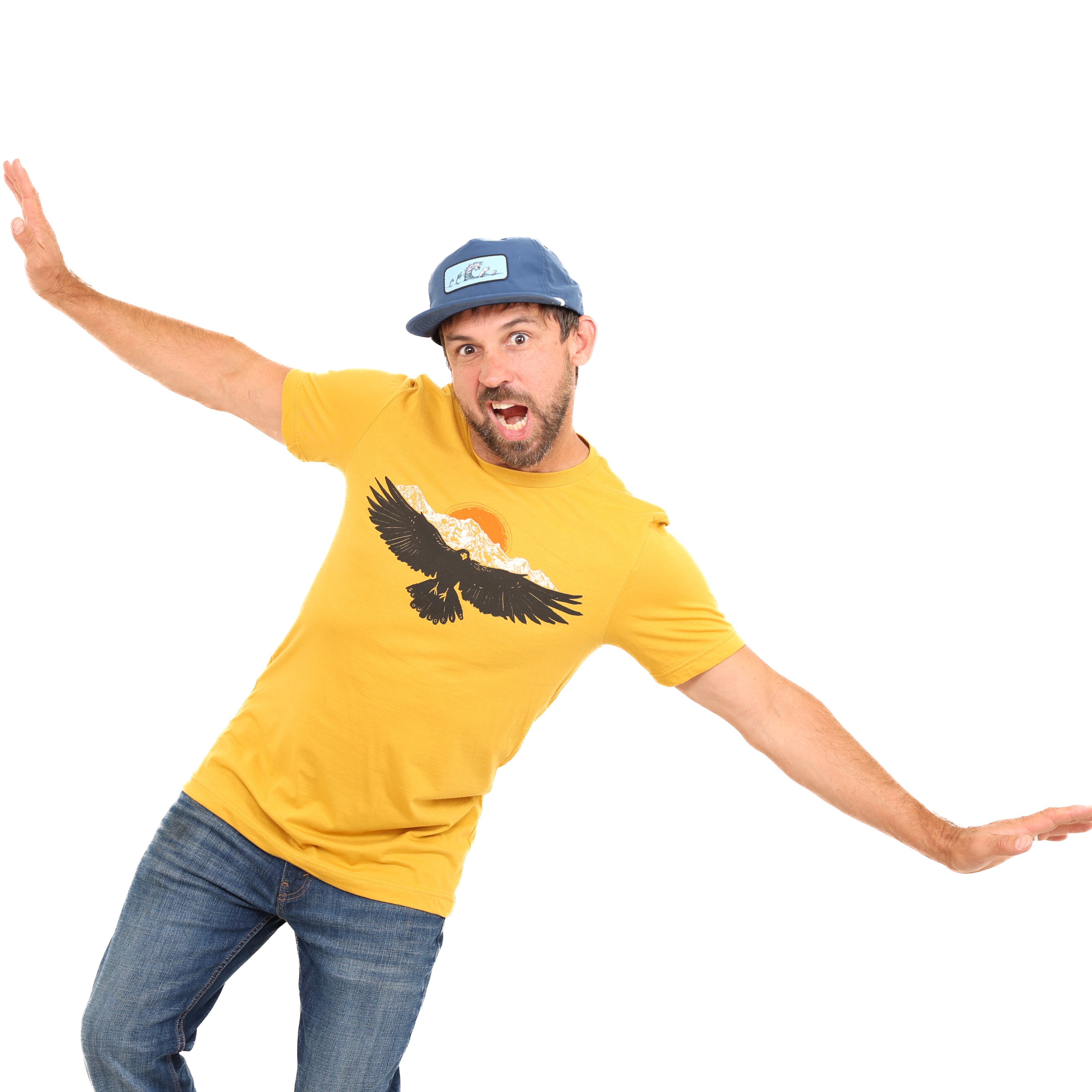 A huge raven takes flight, while behind it, crisp mountaintops are crowned by a glowing sun.