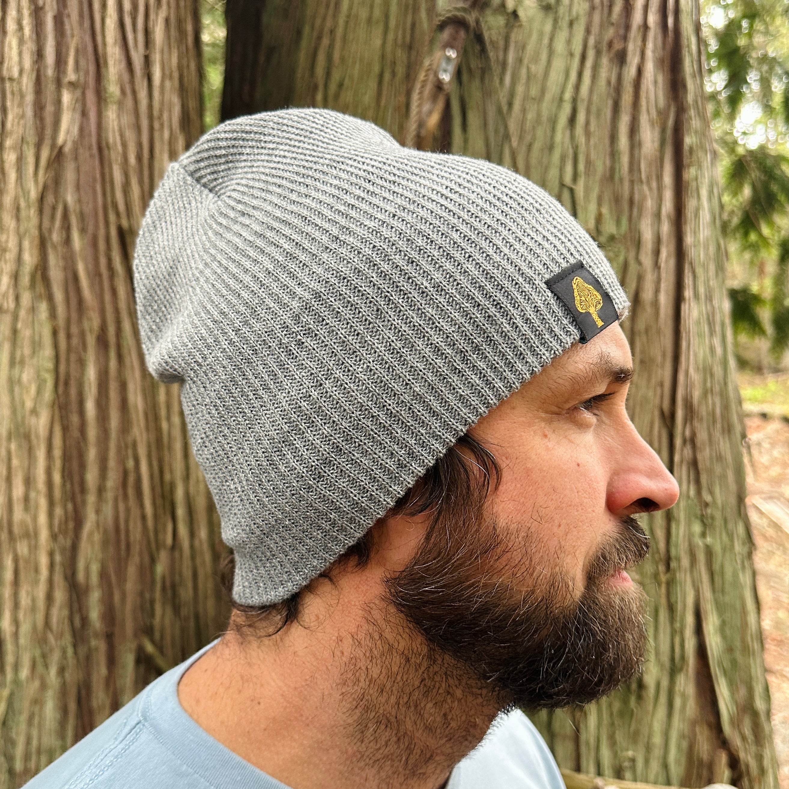 Combining just the right amount of sassy slouch and scrunch, these knit beanies are decorated with a wee golden Chanterelle drawing.