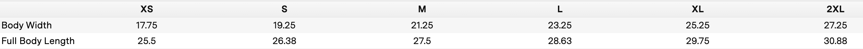 | Chest Width (Laid Flat) | 18 1/2 | 19 1/2 | 20 1/2 | 21 1/2 | 22 3/4 | 24 | 25 1/4 |