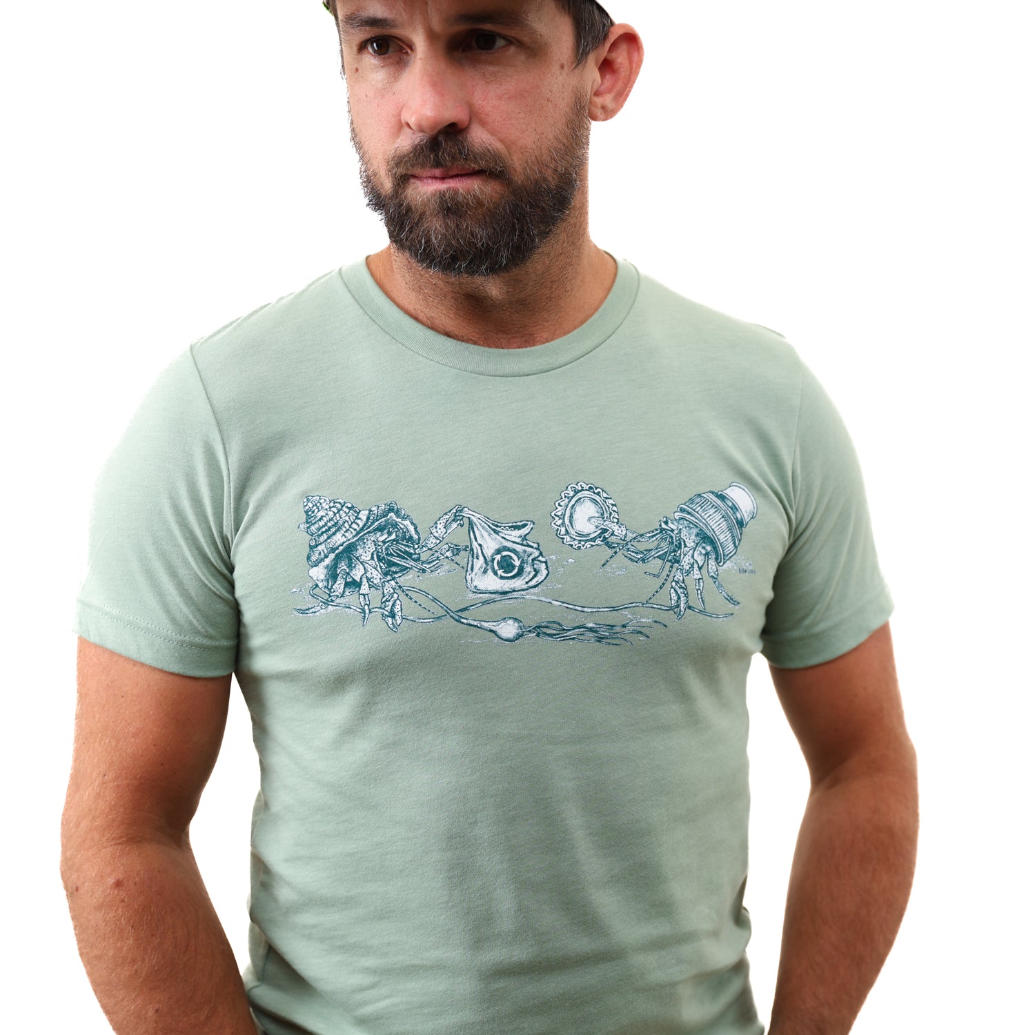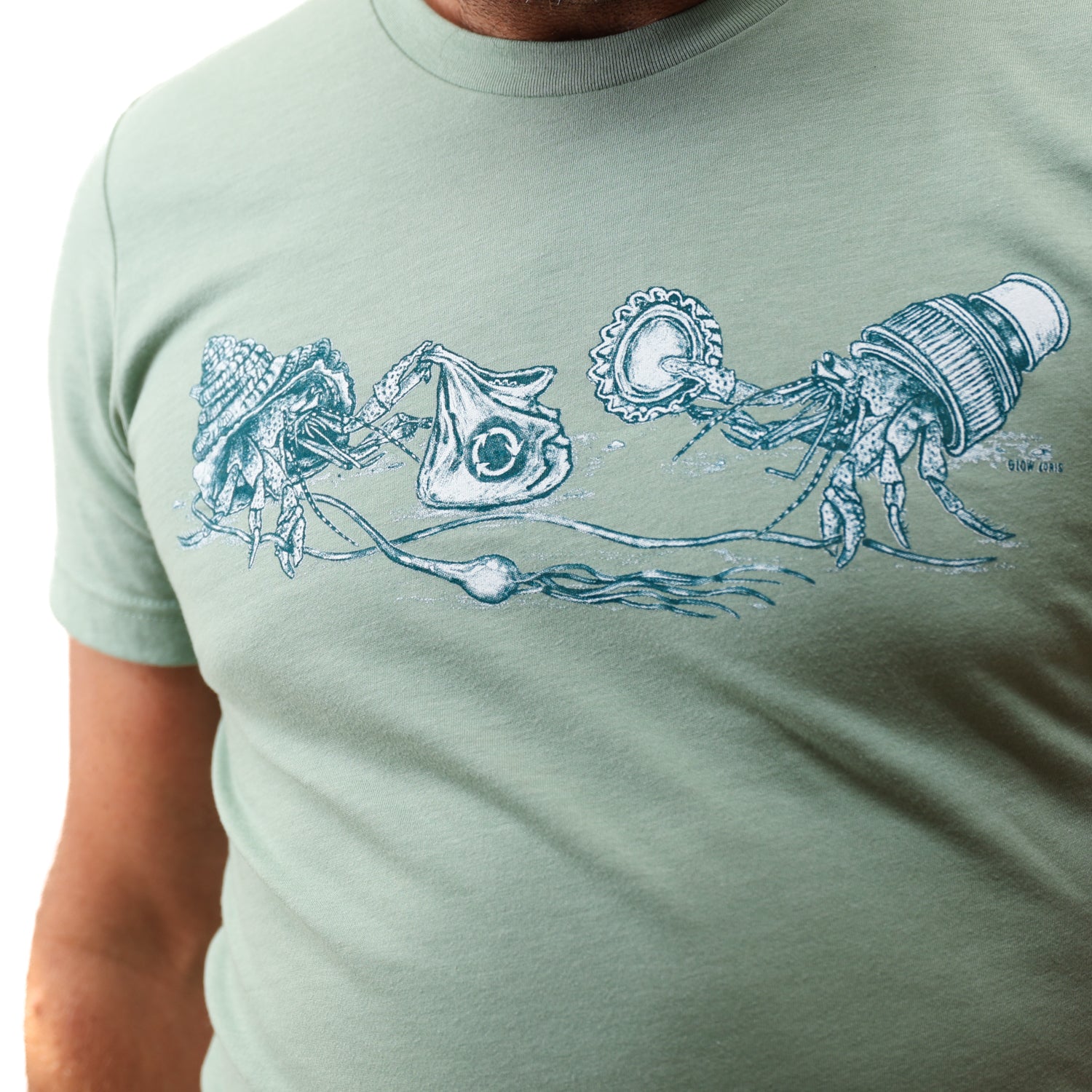 Two hermit crabs lead by example-cleaning up their beach and reusing what they find along the way.