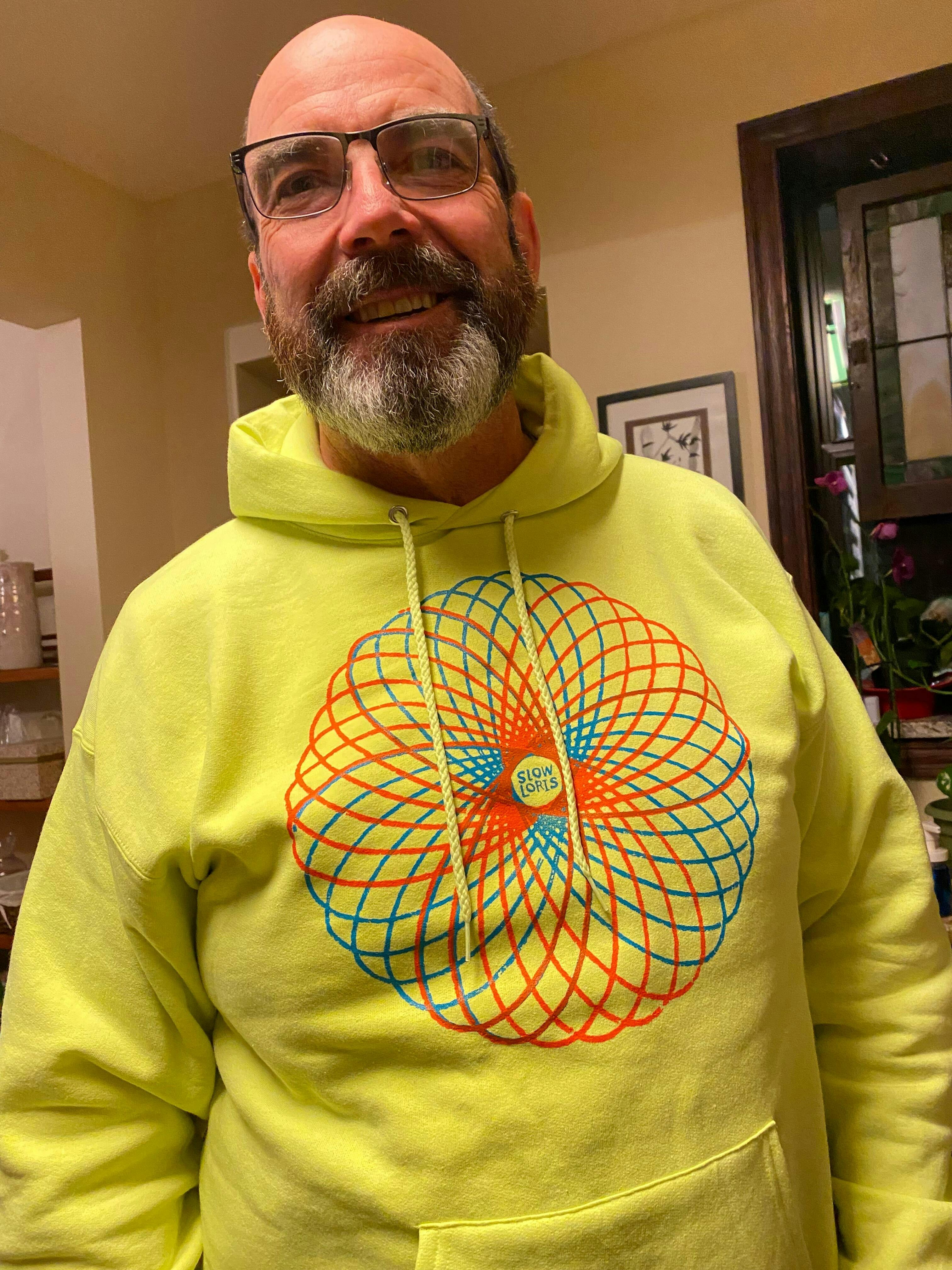 Spirograph printed in blue and orange ink on Safety Green 50/50 Ecosmart* hoodies.