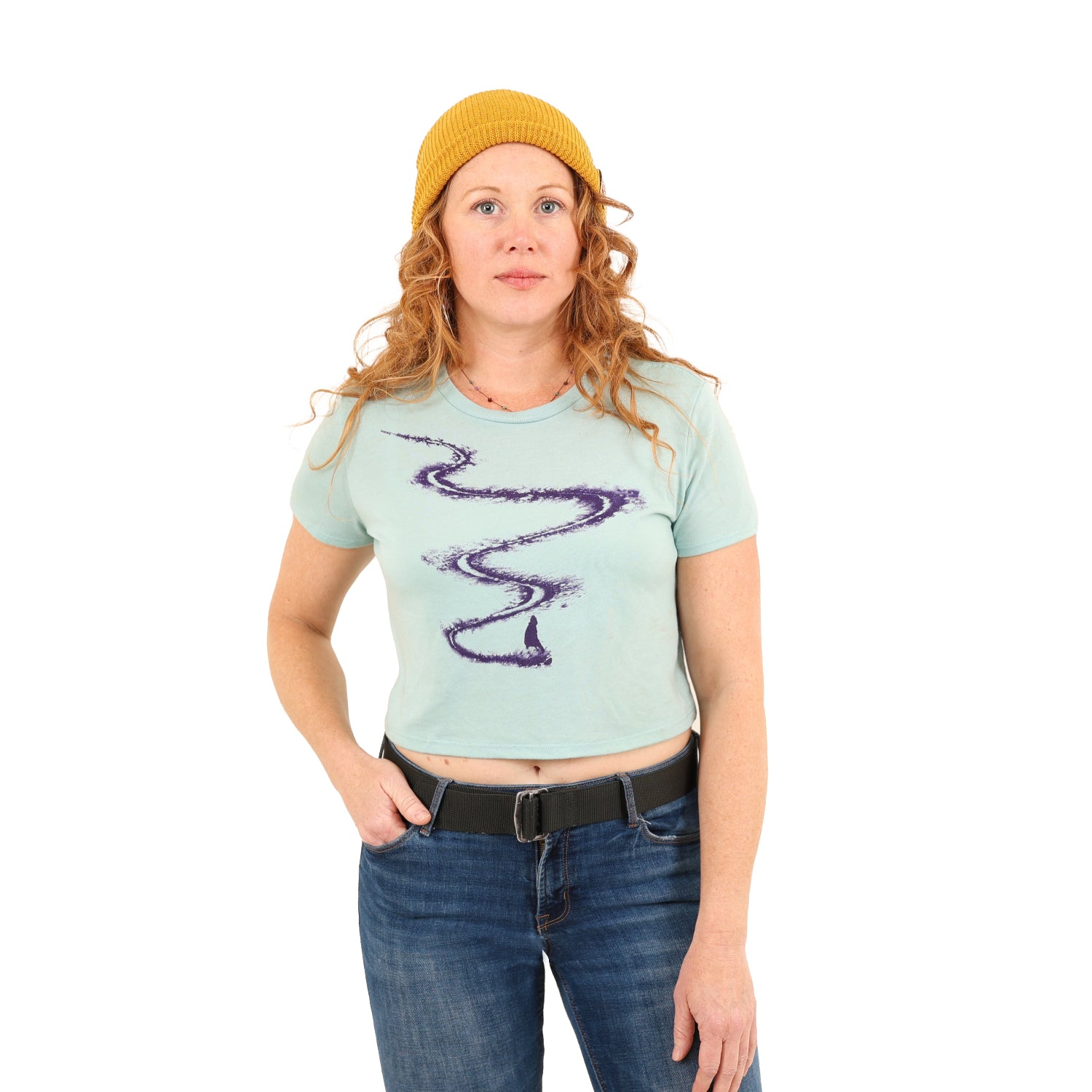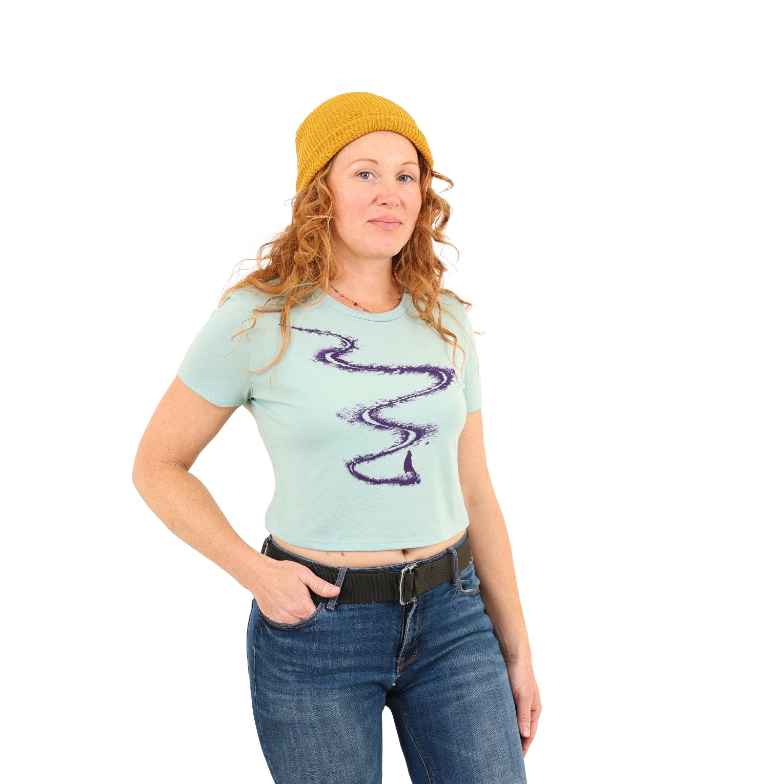 Purple ink on Dusty Blue flowy crop top - 65% polyester/35% viscose
