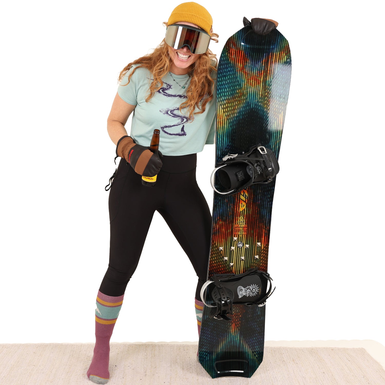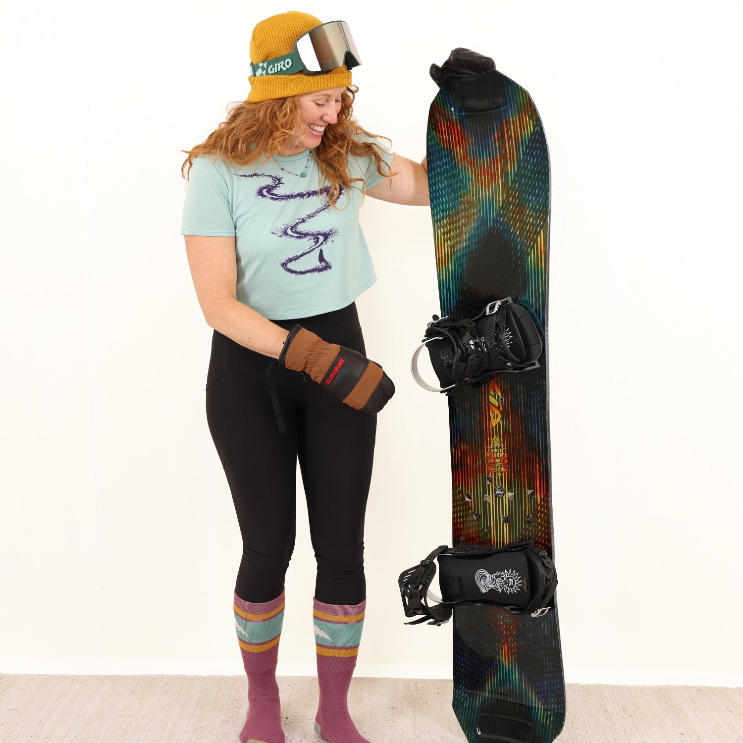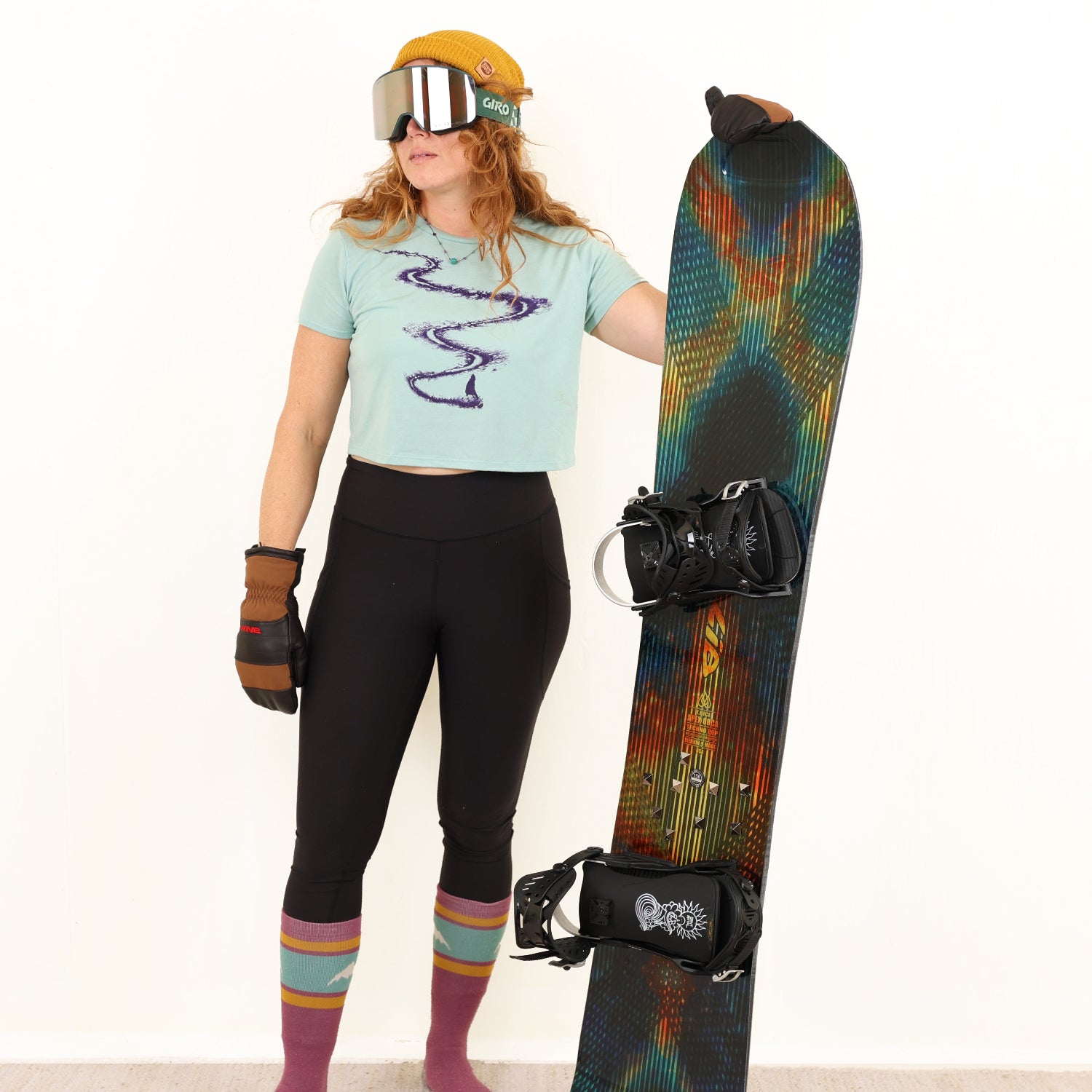 A lone figure, silhouetted in purple, carves fresh powder in a long swoop down an unseen mountain. You know the feeling. You and the snow in sync - everything else is just noise.