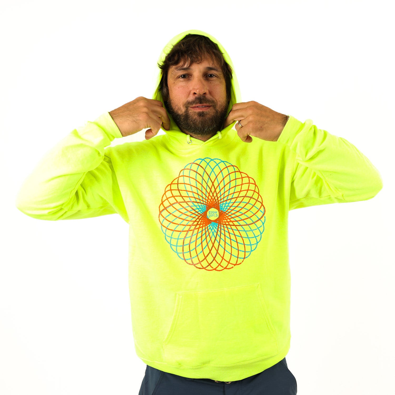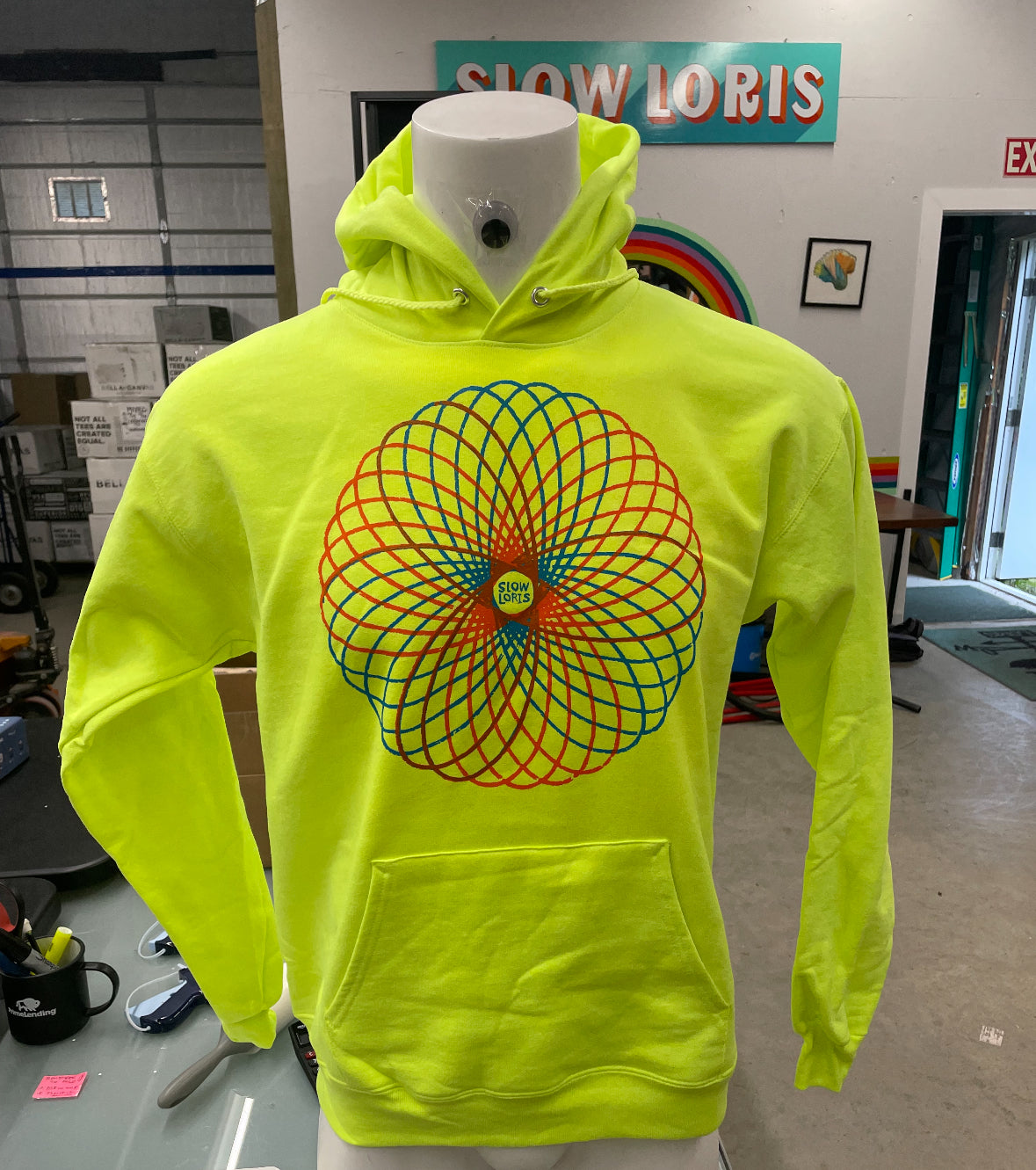 Spirograph printed in blue and orange ink on Safety Green 50/50 Ecosmart* hoodies.