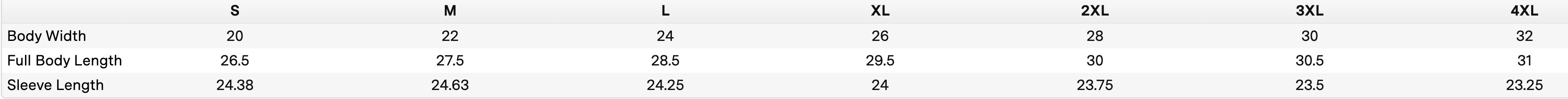 | Chest Width (Laid Flat) | 18 1/2 | 19 1/2 | 20 1/2 | 21 1/2 | 22 3/4 | 24 | 25 1/4 |