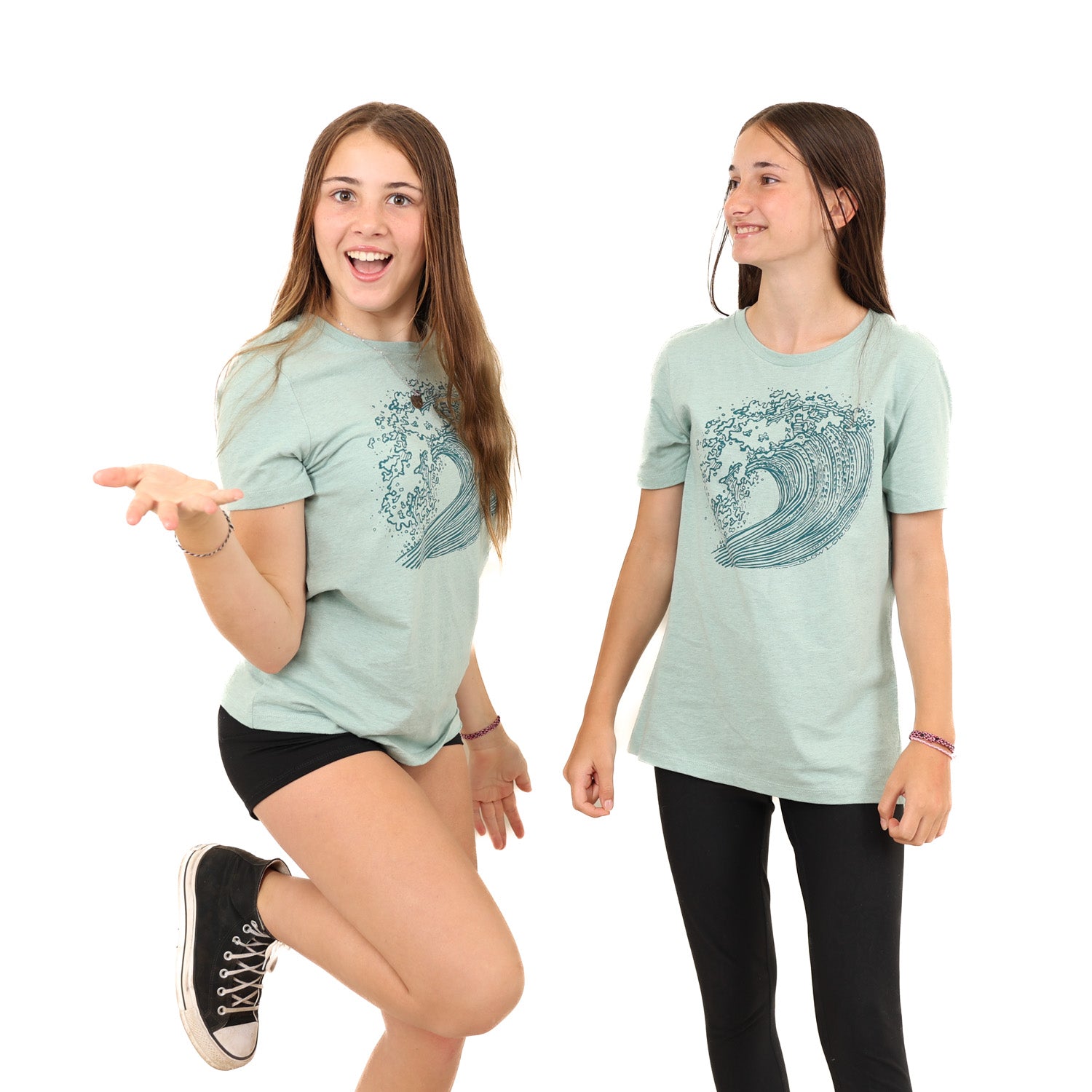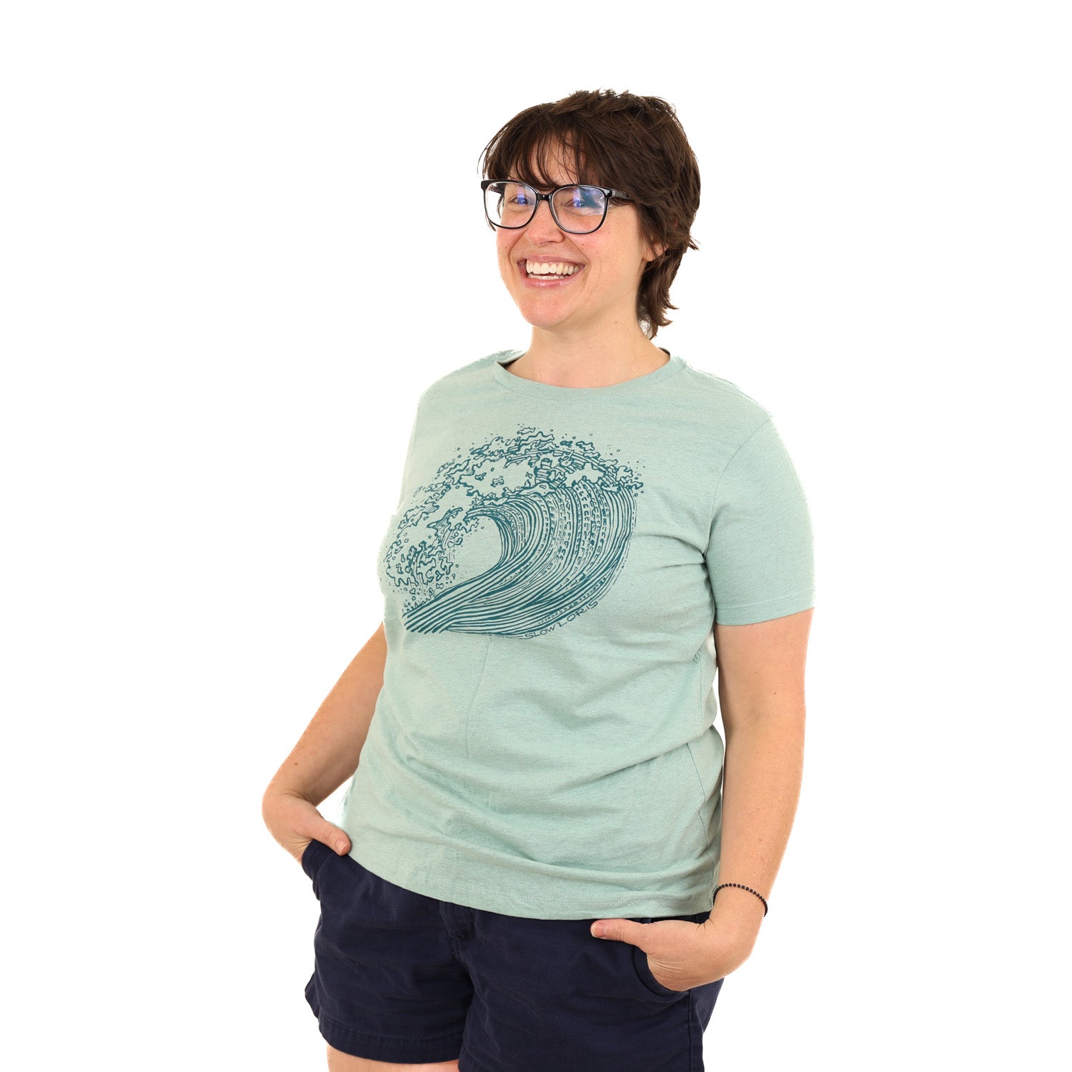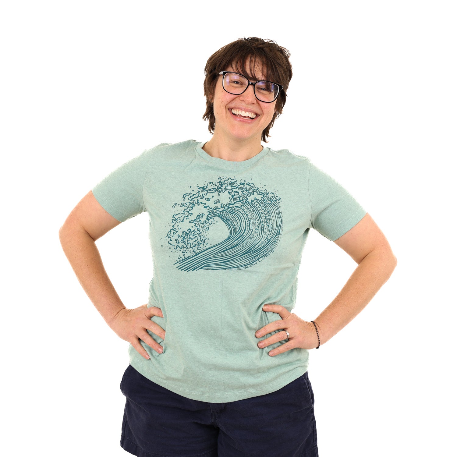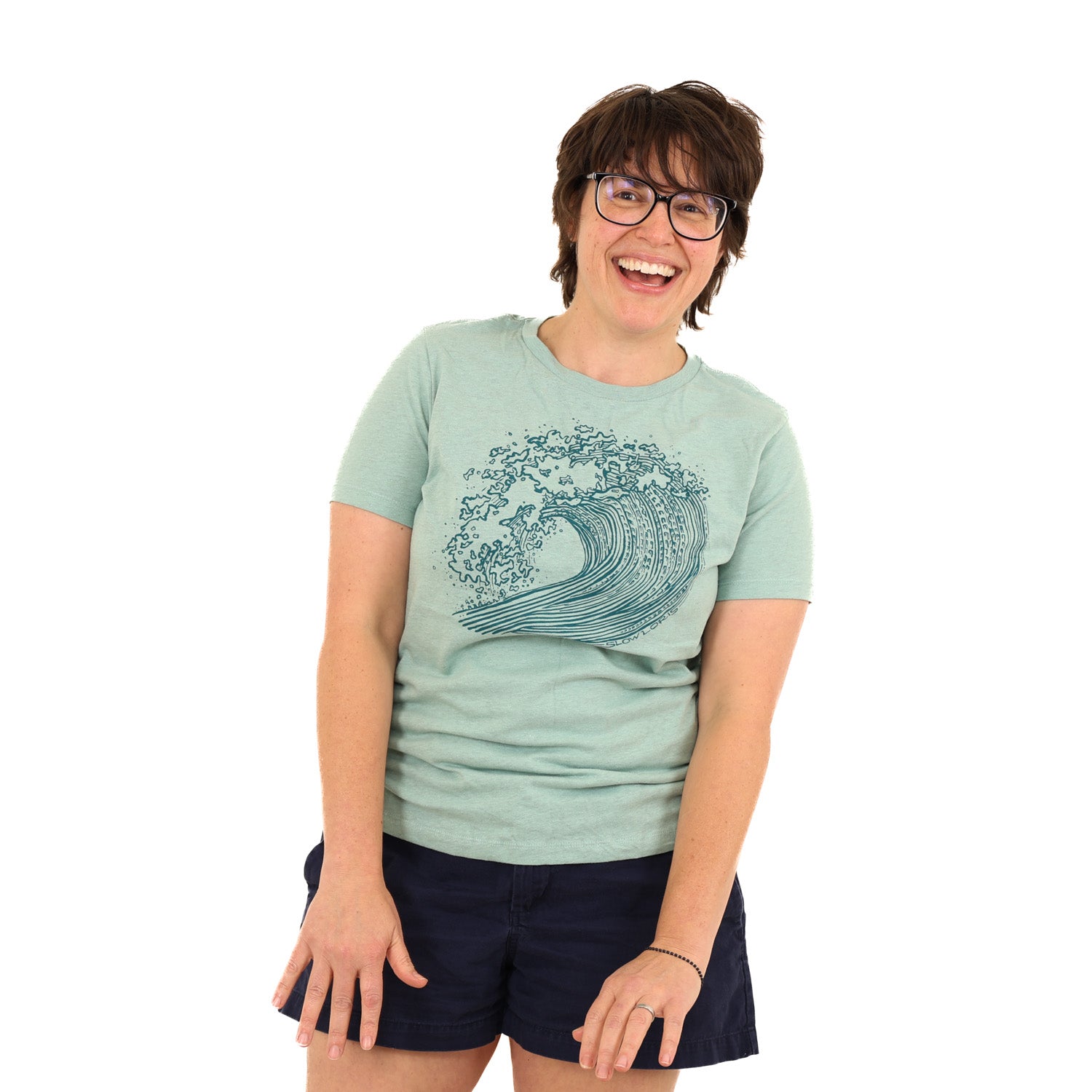 Deep Teal ink on Heather Prism Dusty Blue tee. 100% cotton. Women's sizing.