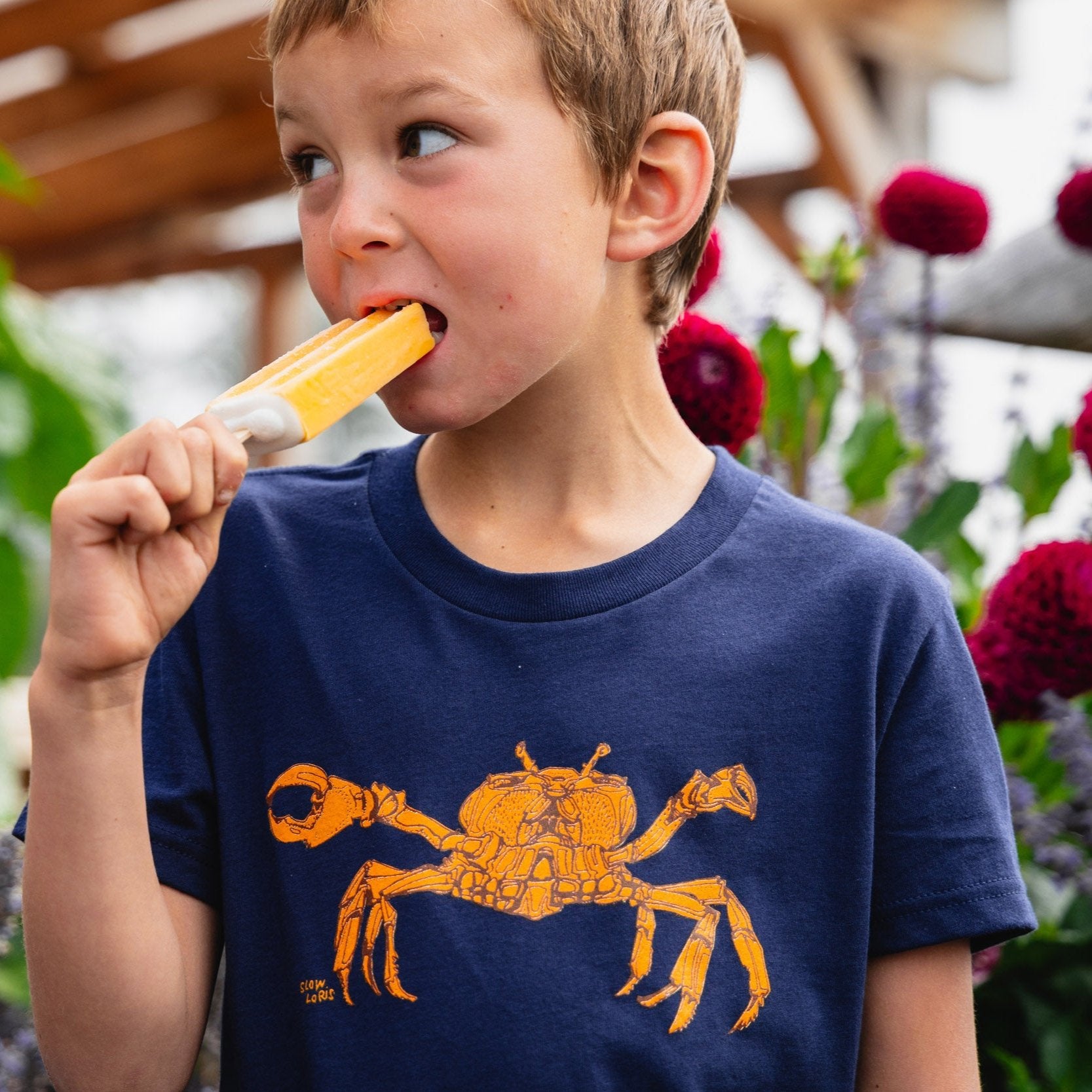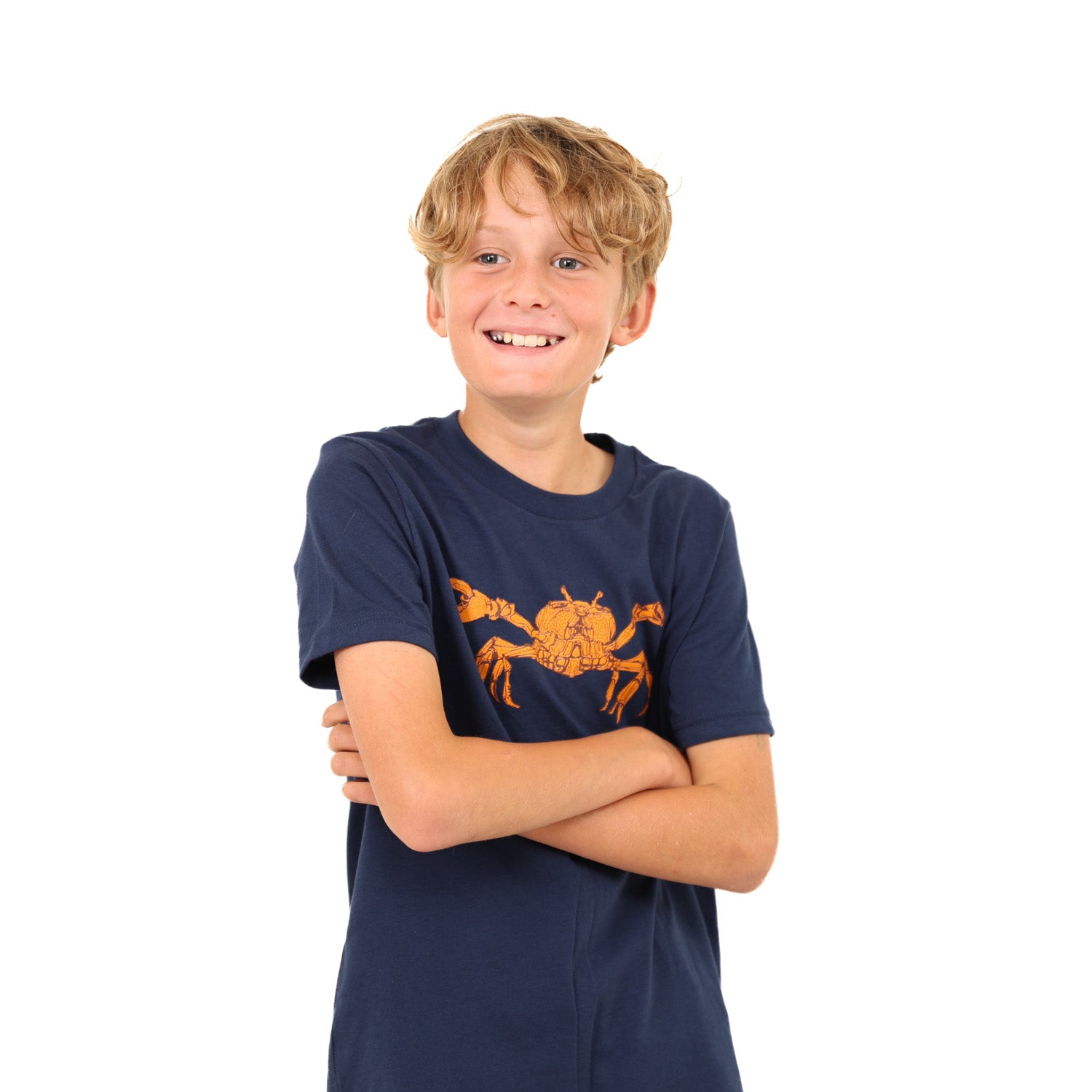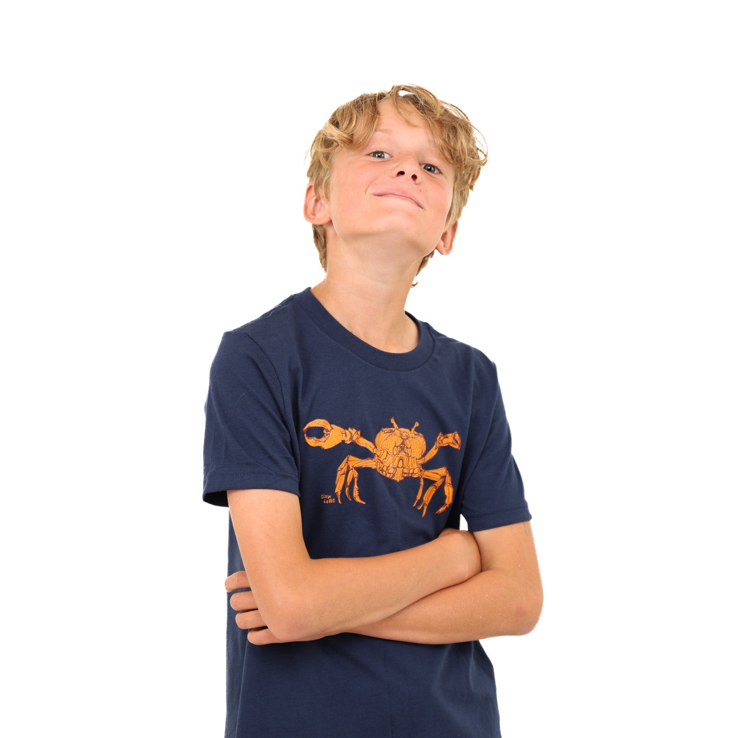 Our best selling Crab, printed in two colors on Kids 100% cotton Navy blue t-shirts.