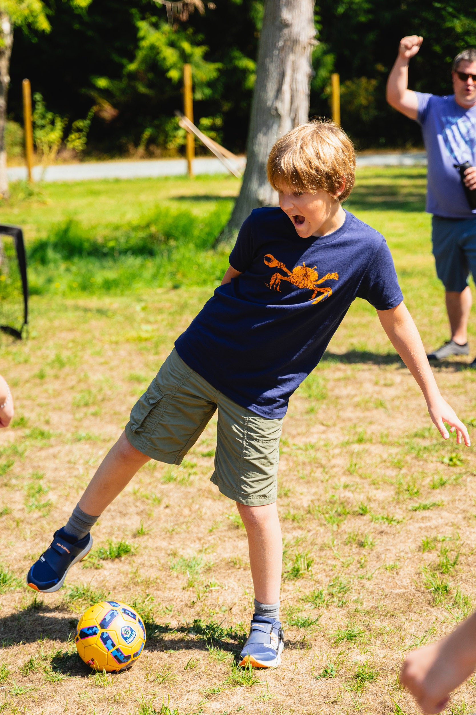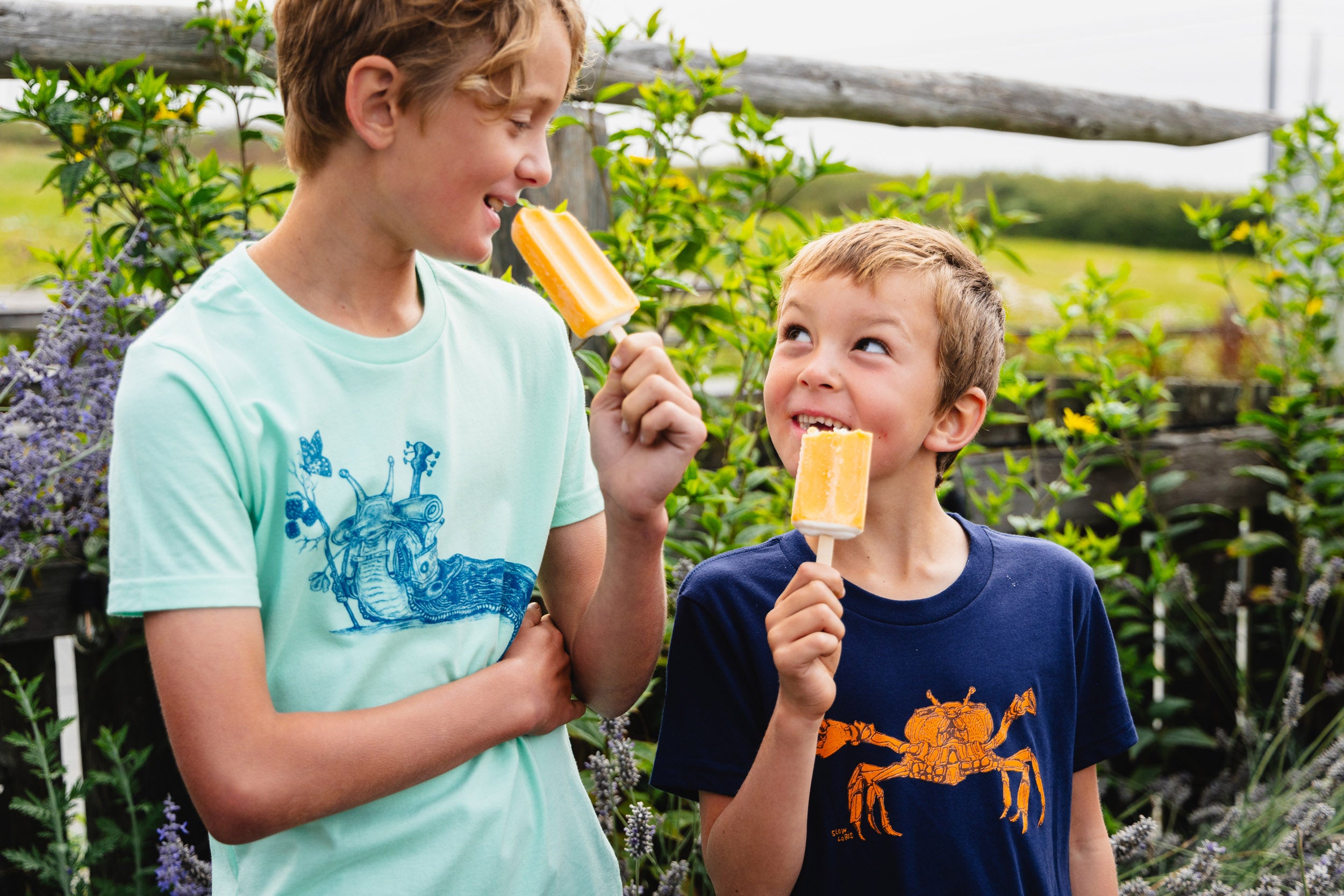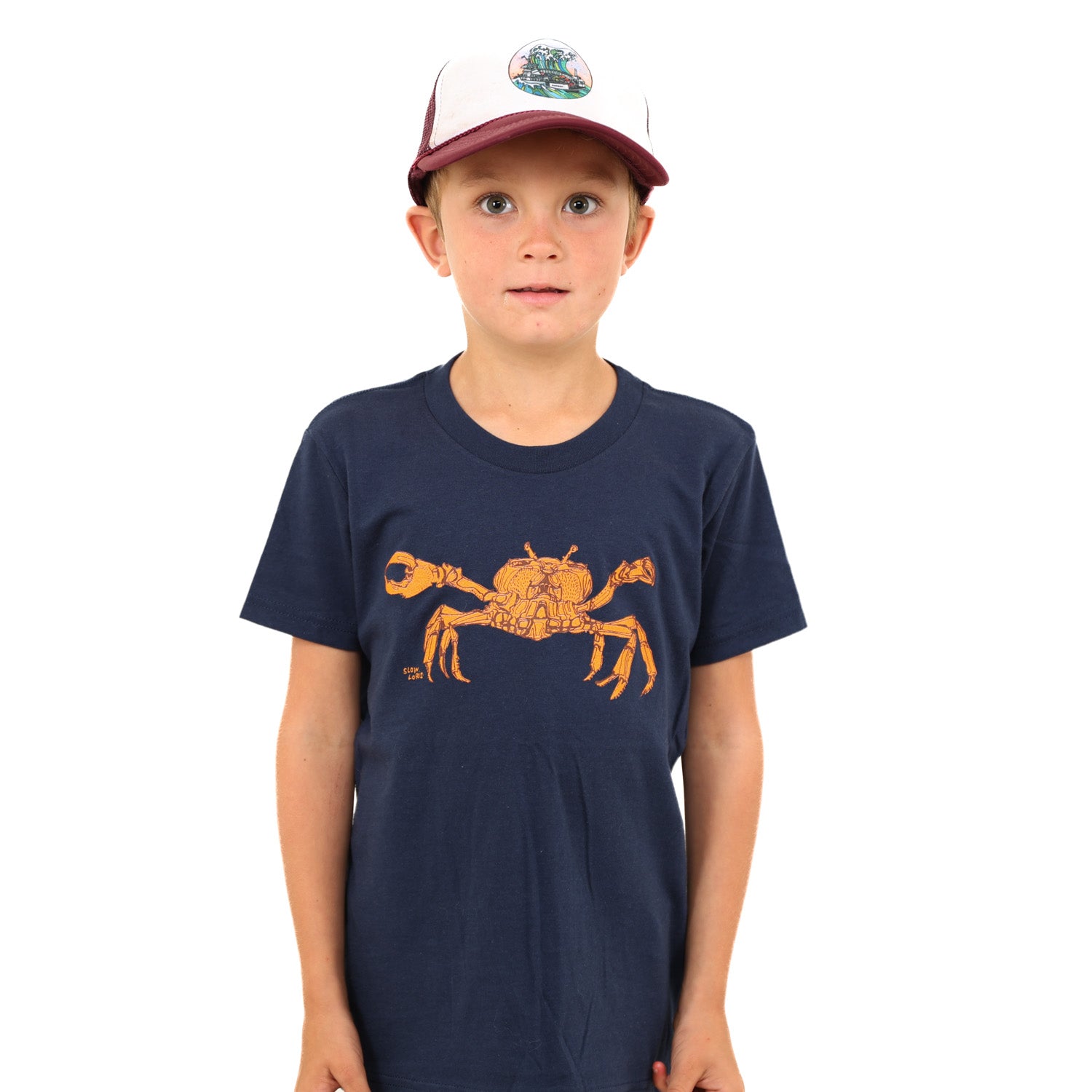 Our best selling Crab, printed in two colors on Kids 100% cotton Navy blue t-shirts.