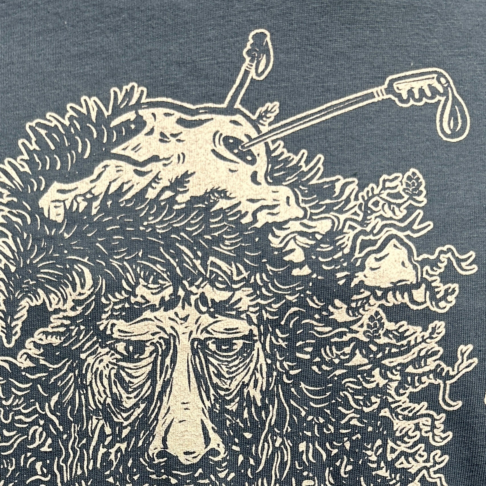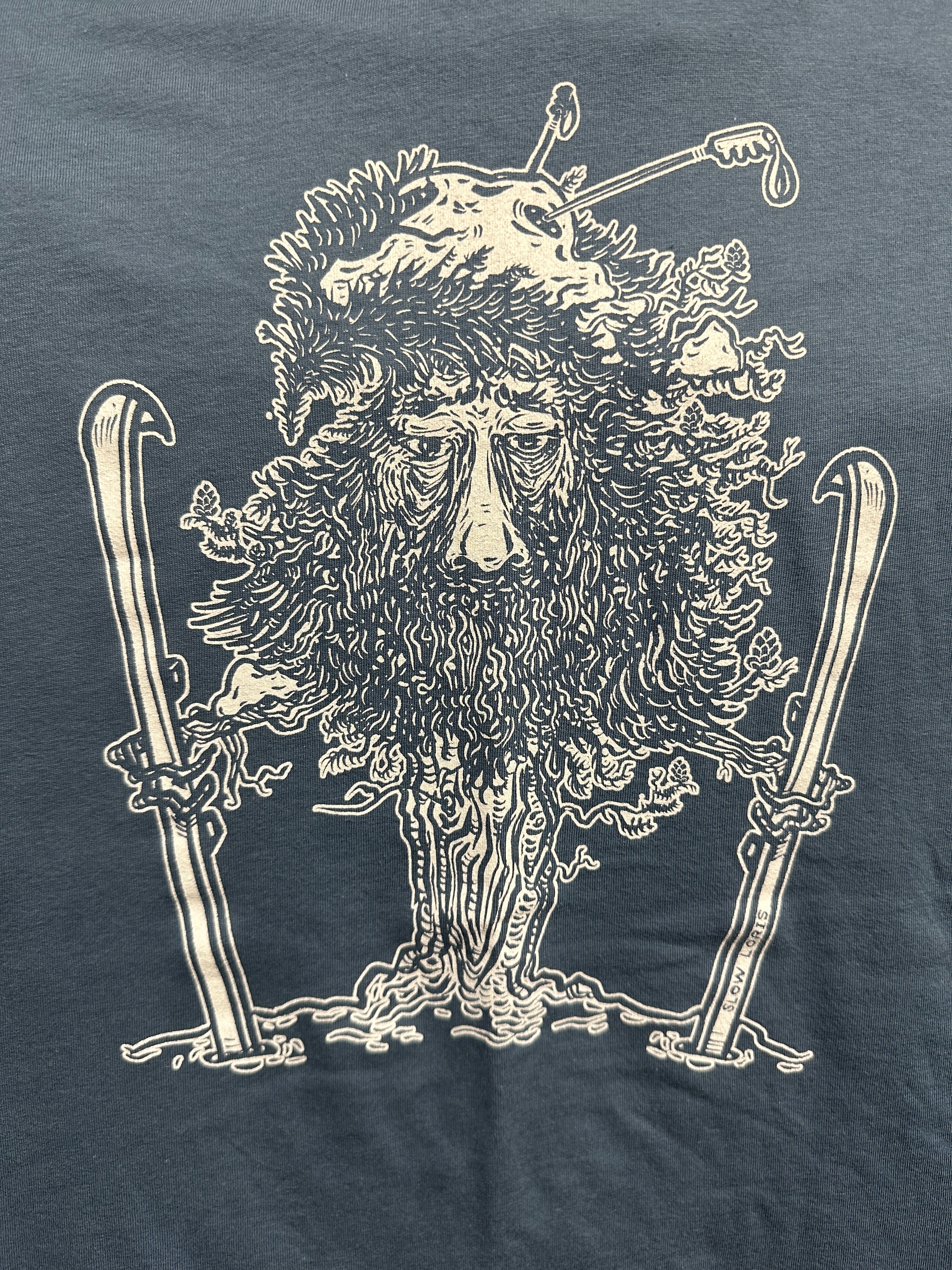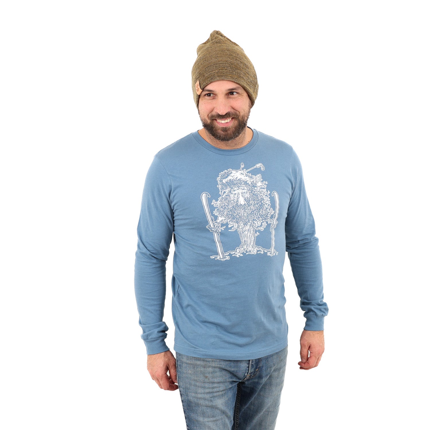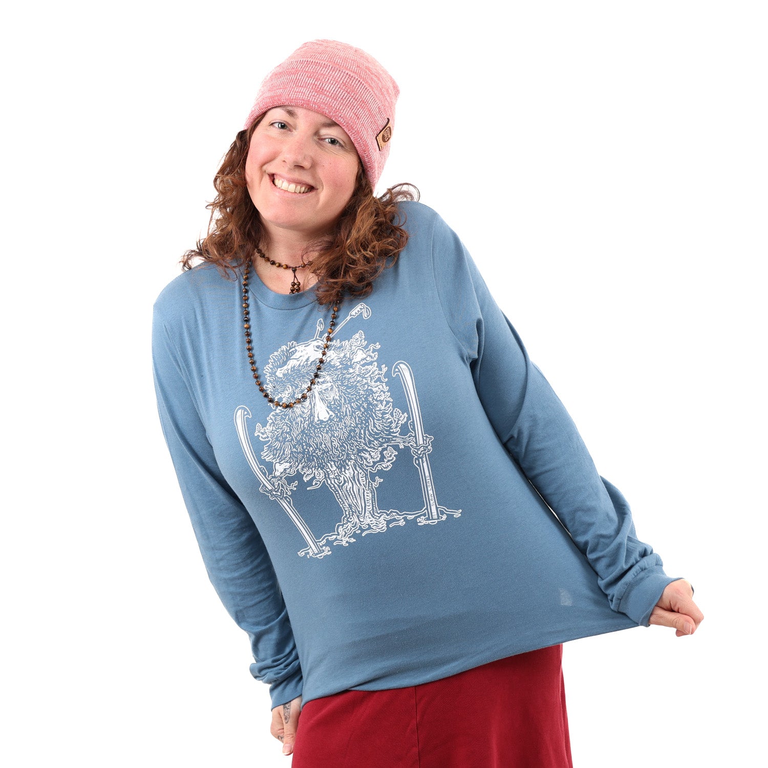 White ink on Steel Blue 100% cotton long sleeve tees.