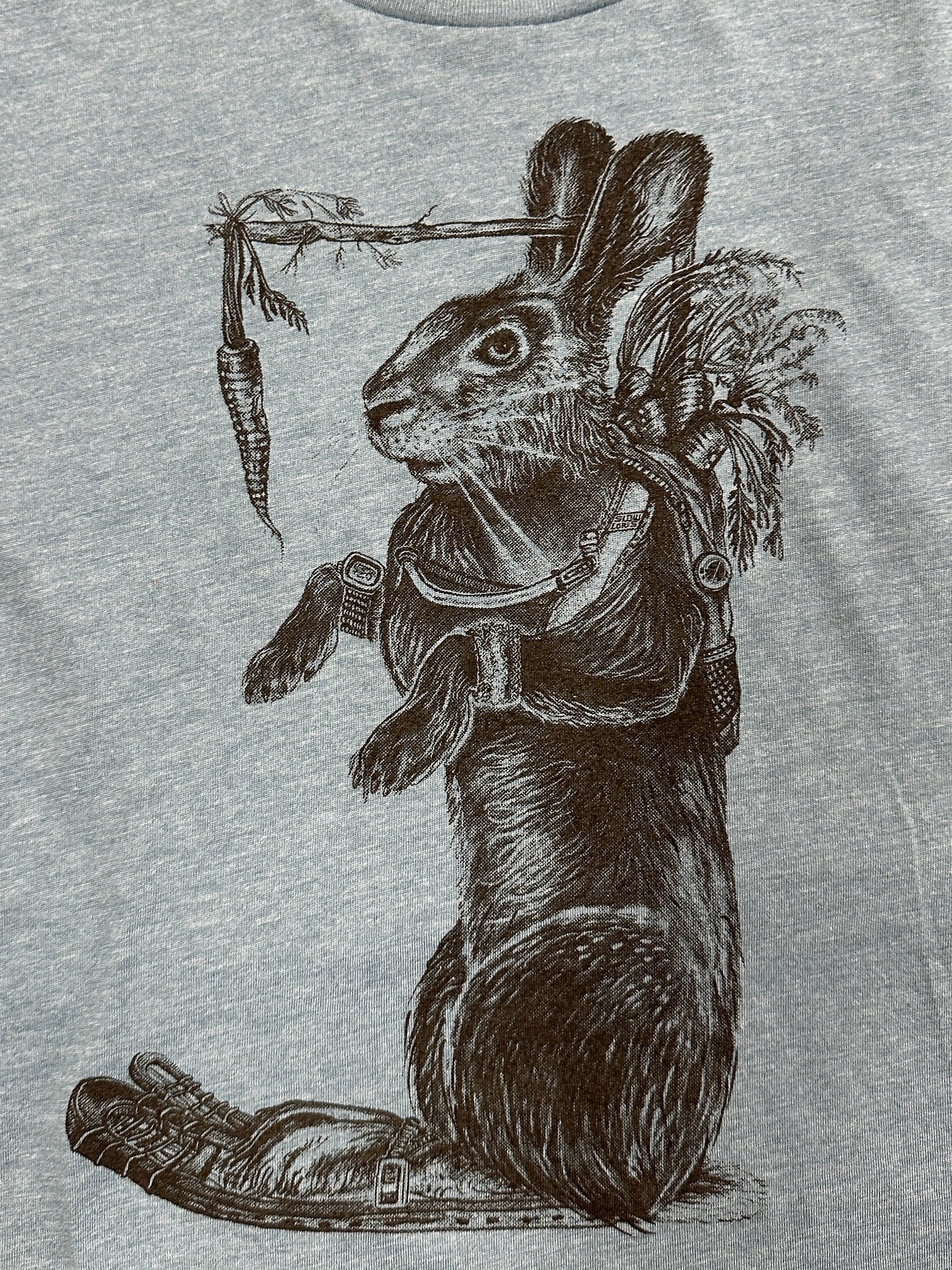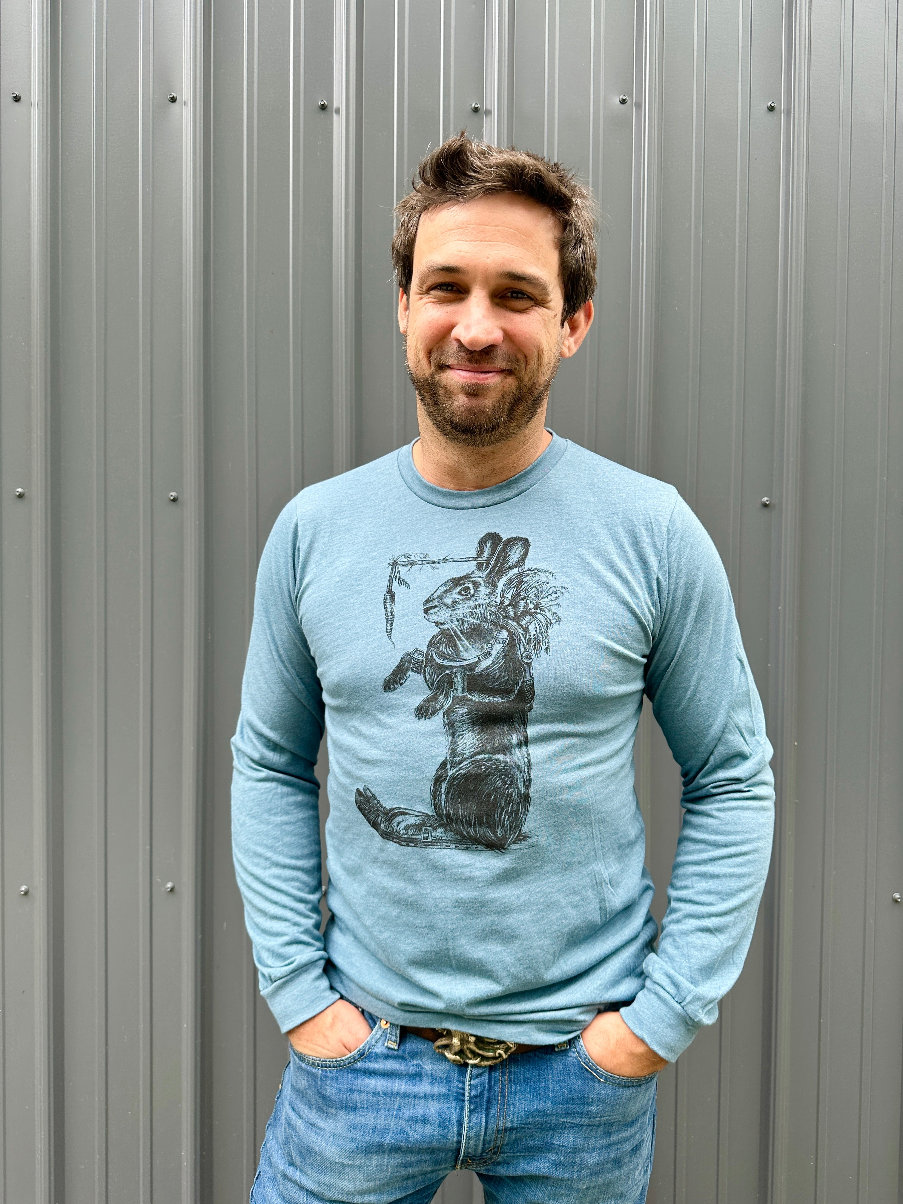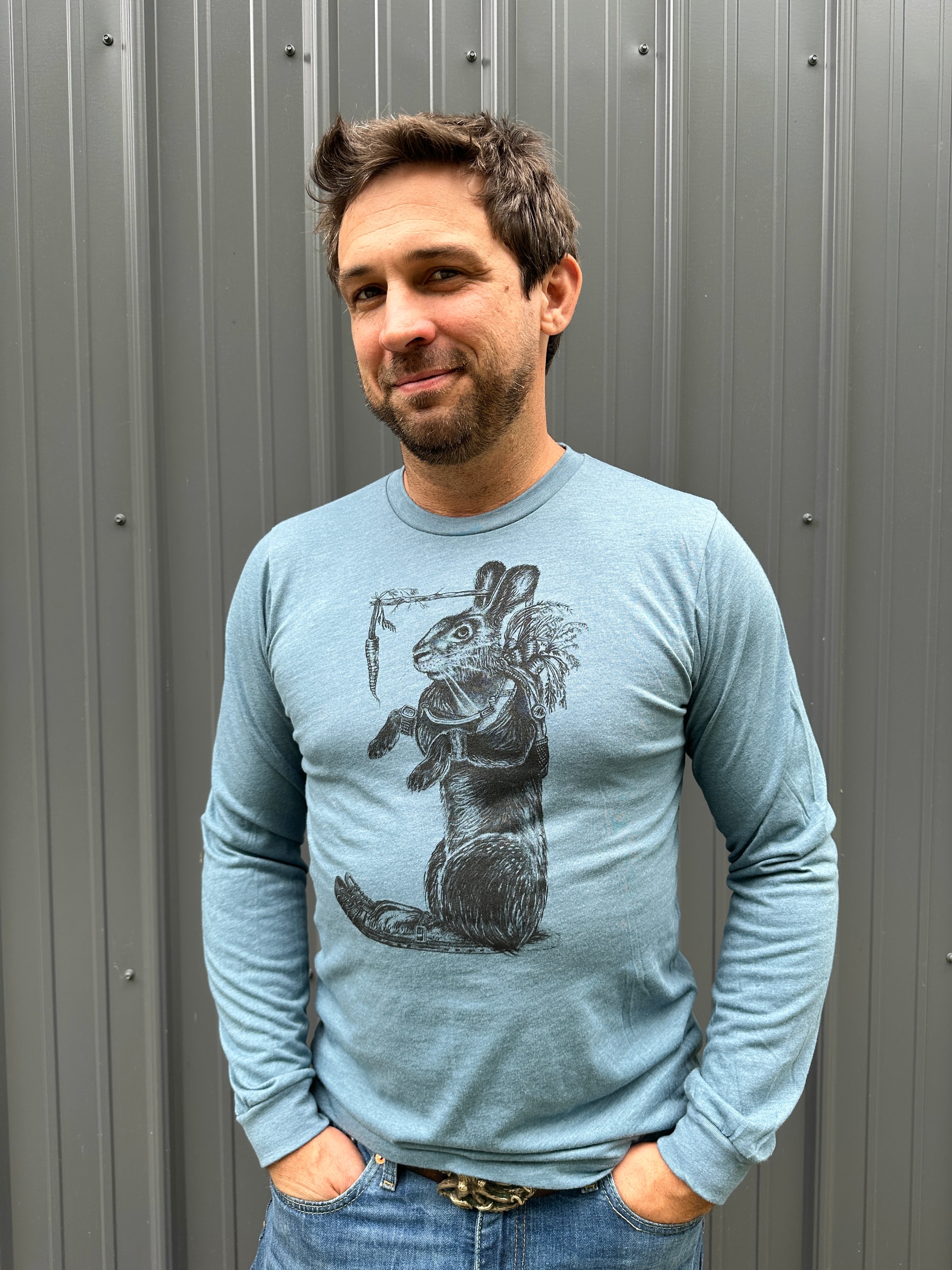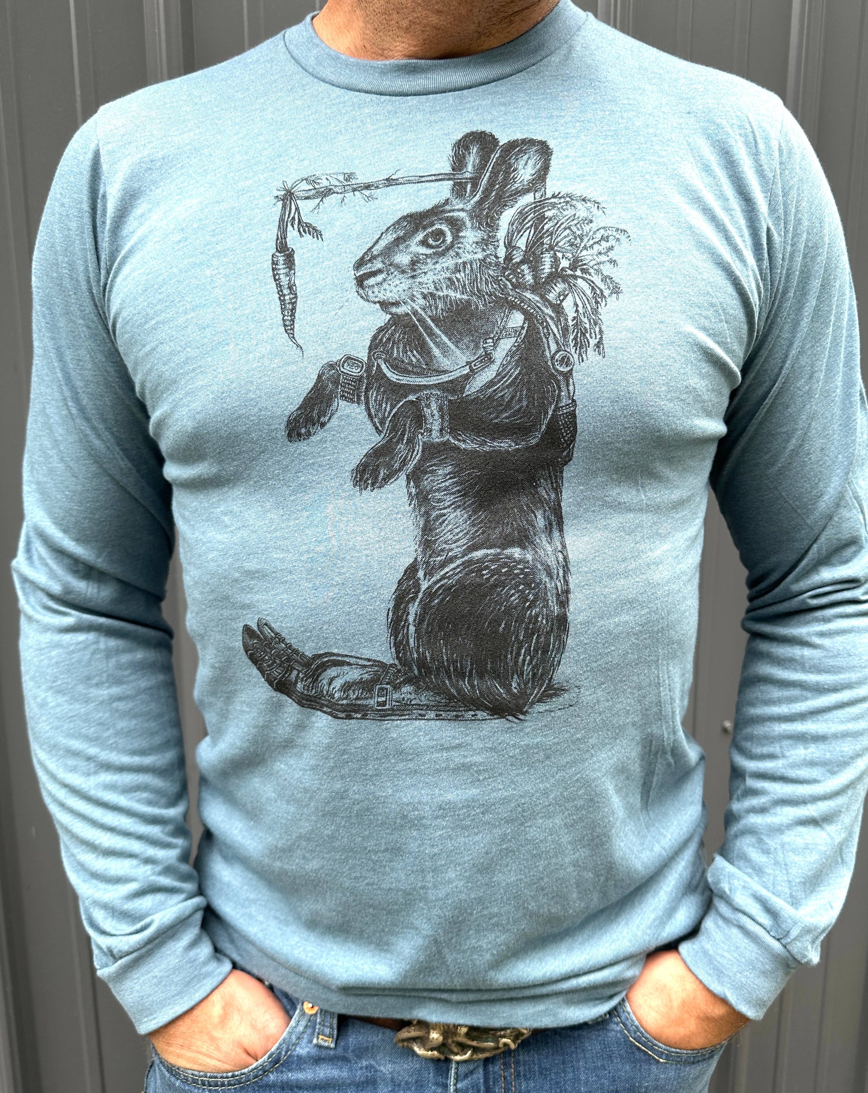 Printed in Black ink on Heather Slate cotton/poly* longsleeved tees.