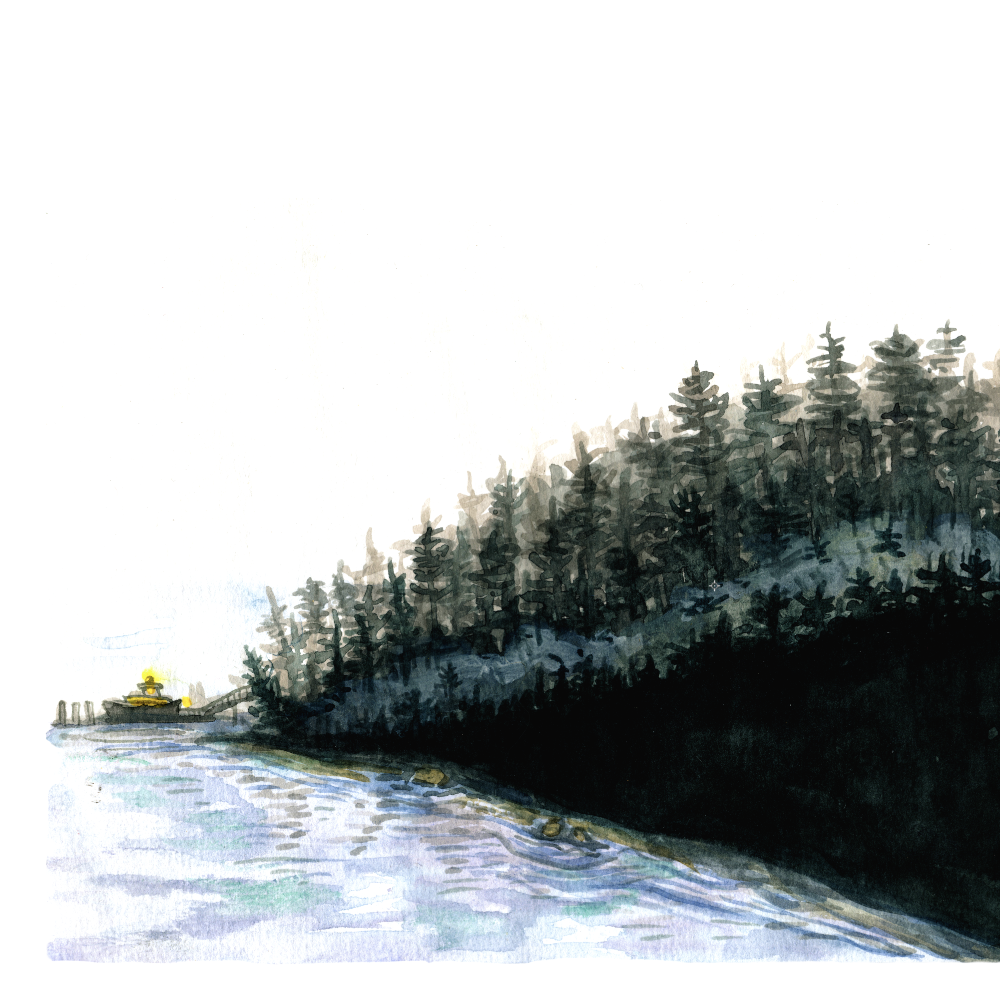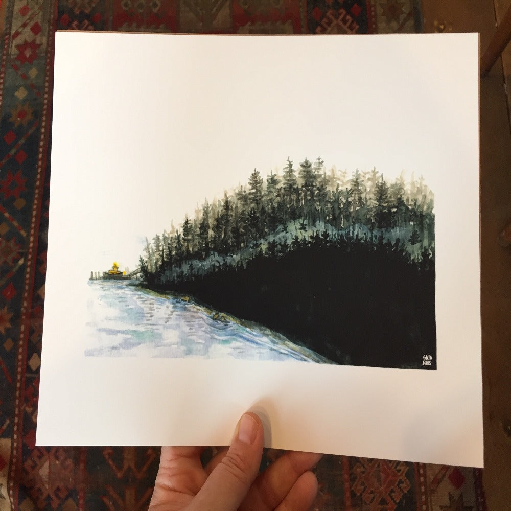 This is our print called Fog Island, a watercolor picturing a view of the Guemes Island ferry on a foggy morning this past fall. The fog traveling through the trees in layers of grey.