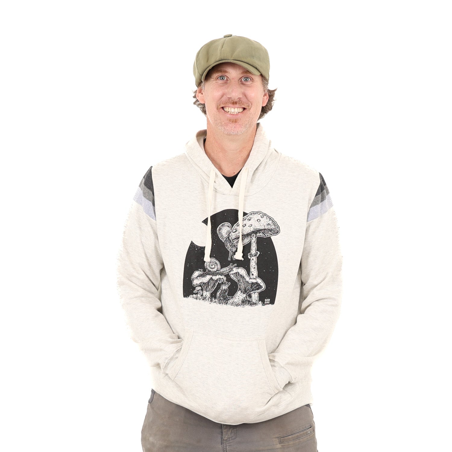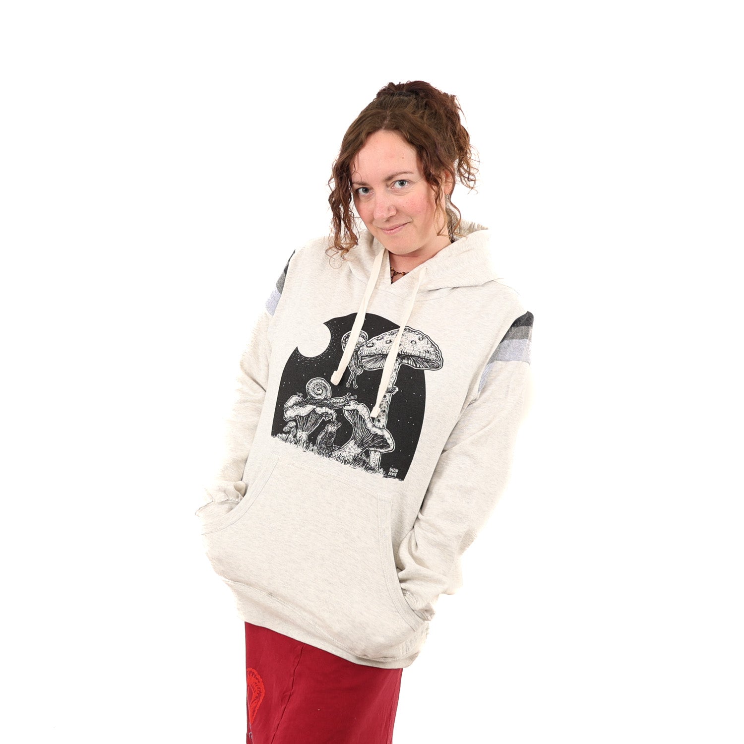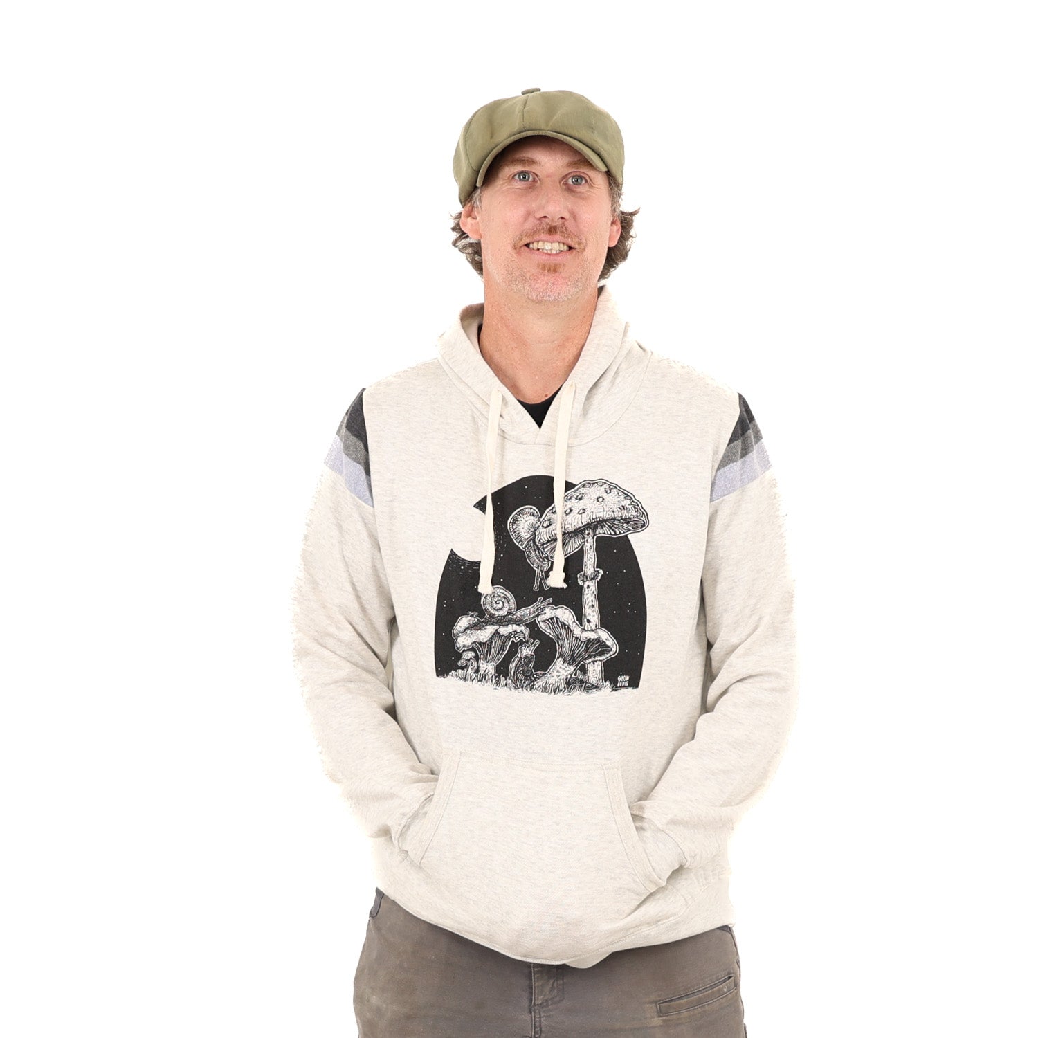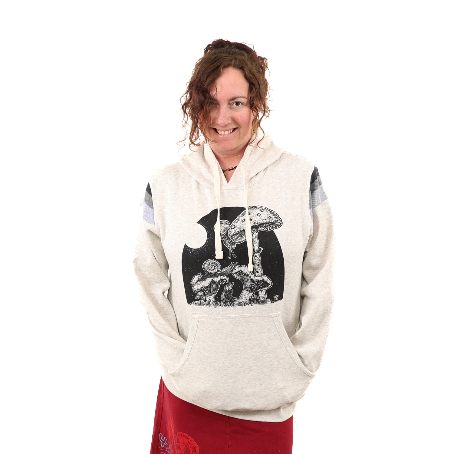 Full Moon Buffet on an Oatmeal pullover hoodie with gray and black striped shoulder inserts. Ribbed-knit cuffs and waistband.