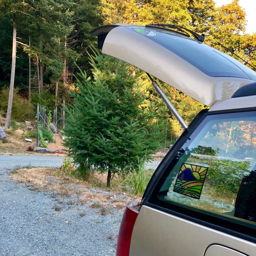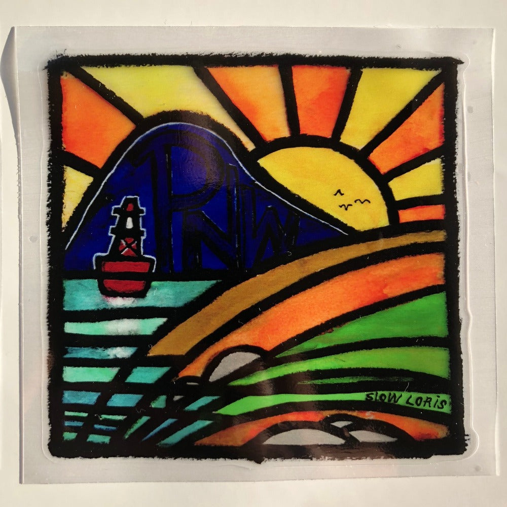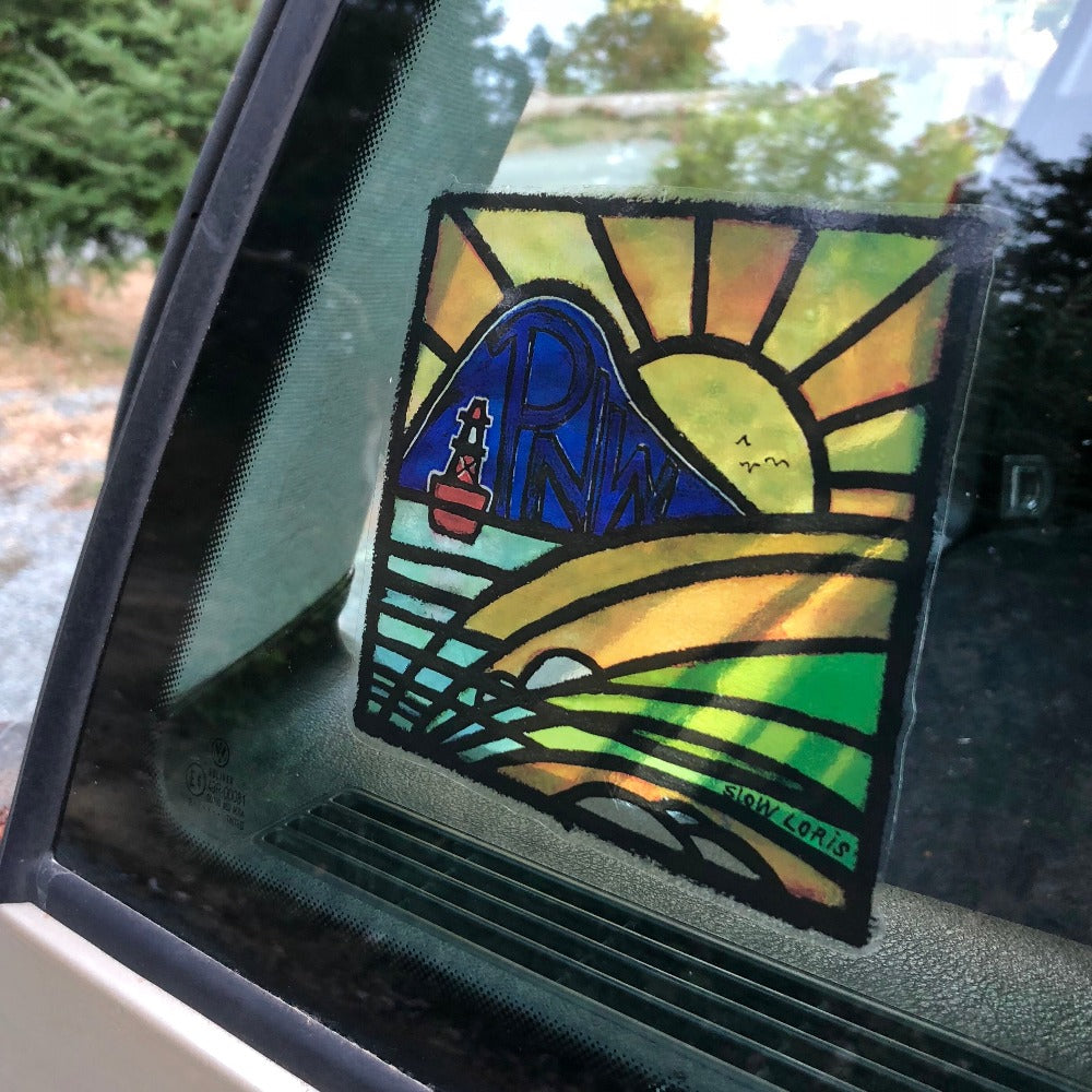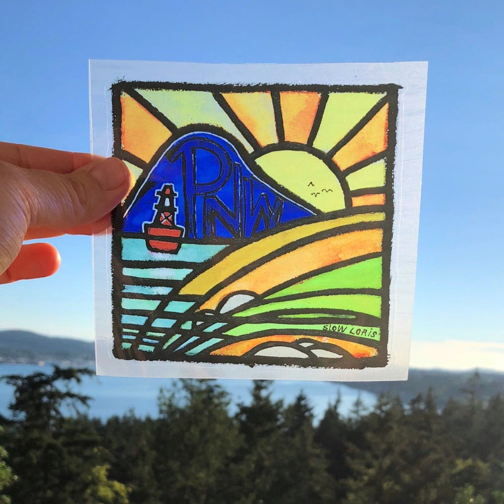 When light shines through, the hidden PNW appears. When stuck against a solid backing, colors are more saturated, and PNW becomes a subtle part of the mountain.