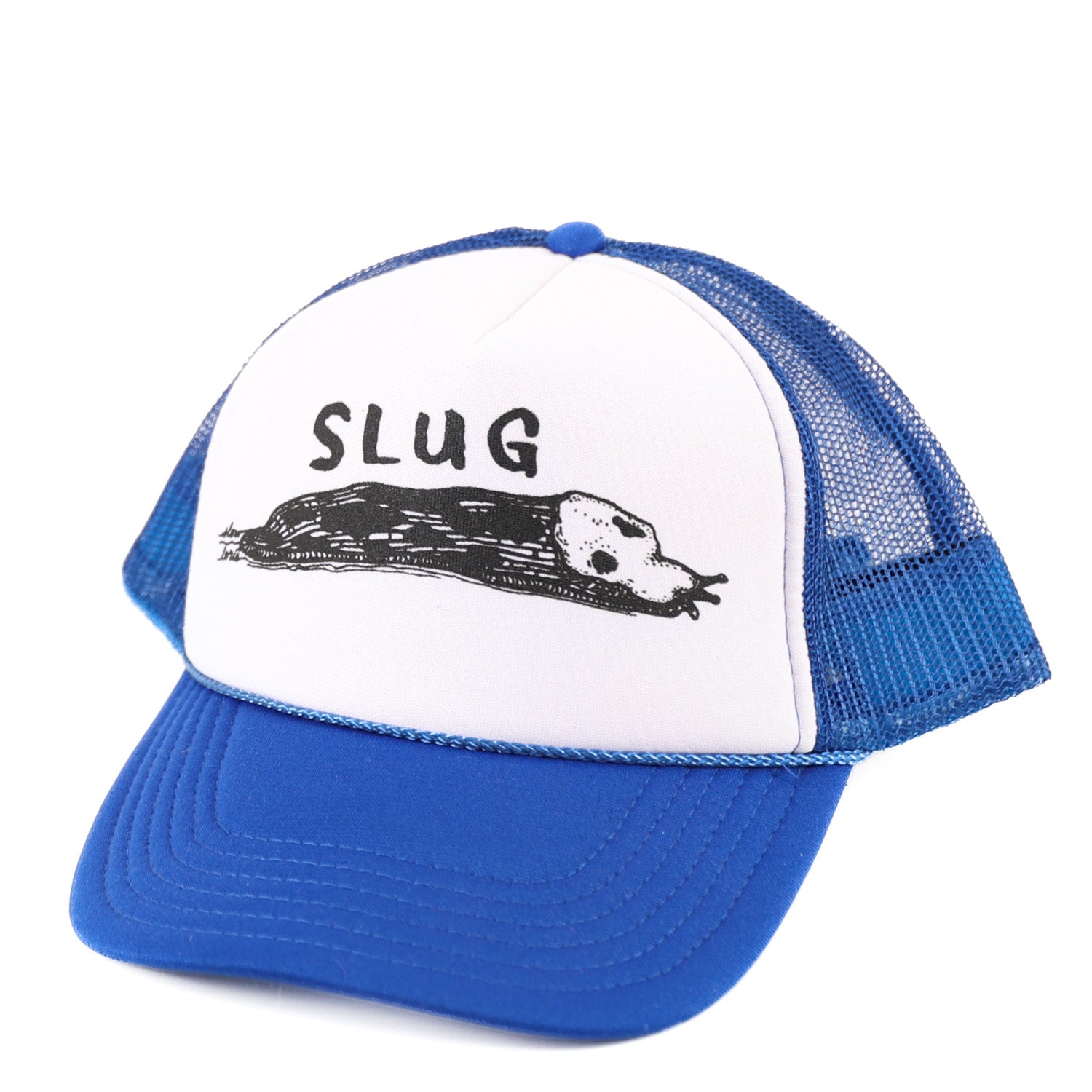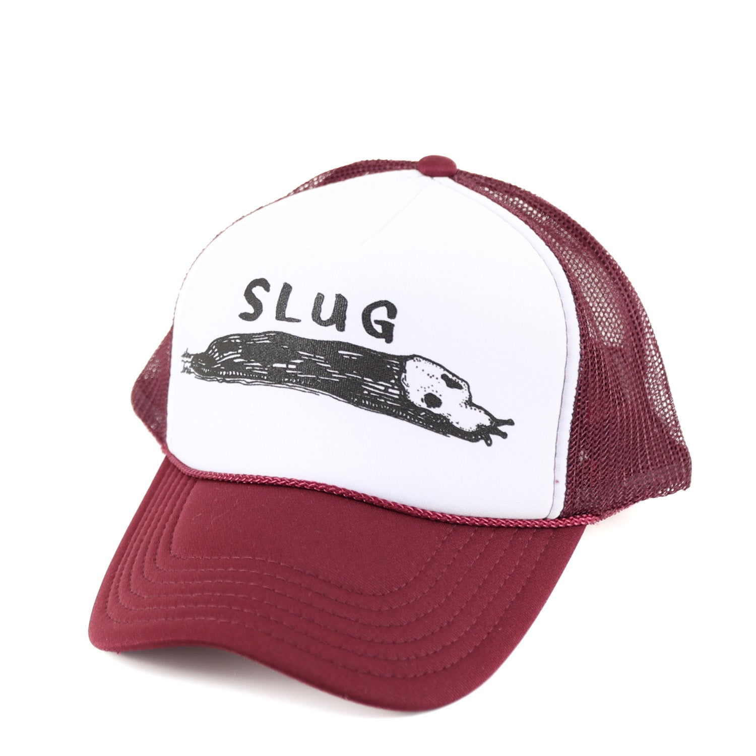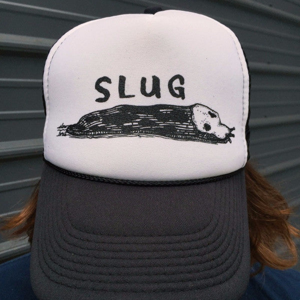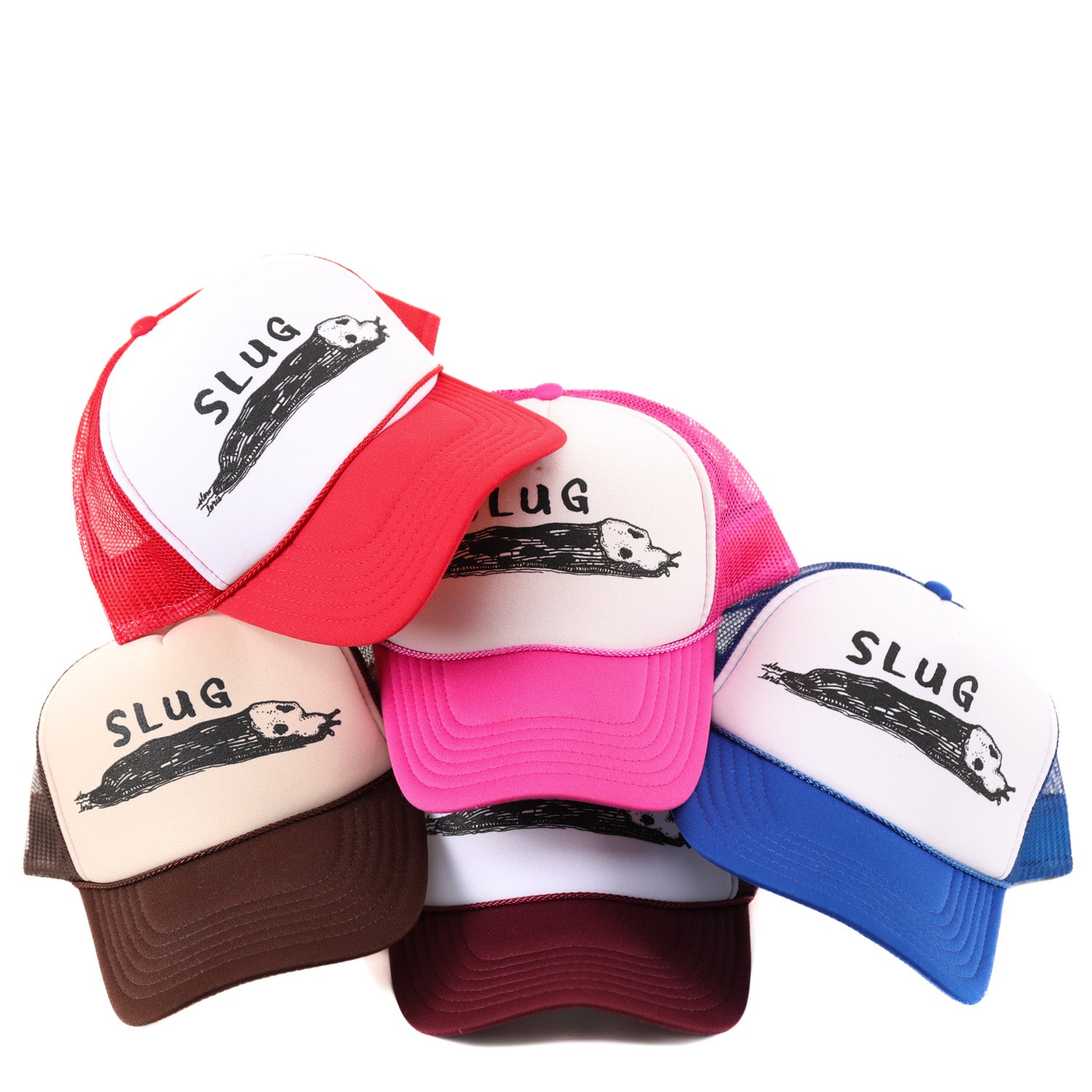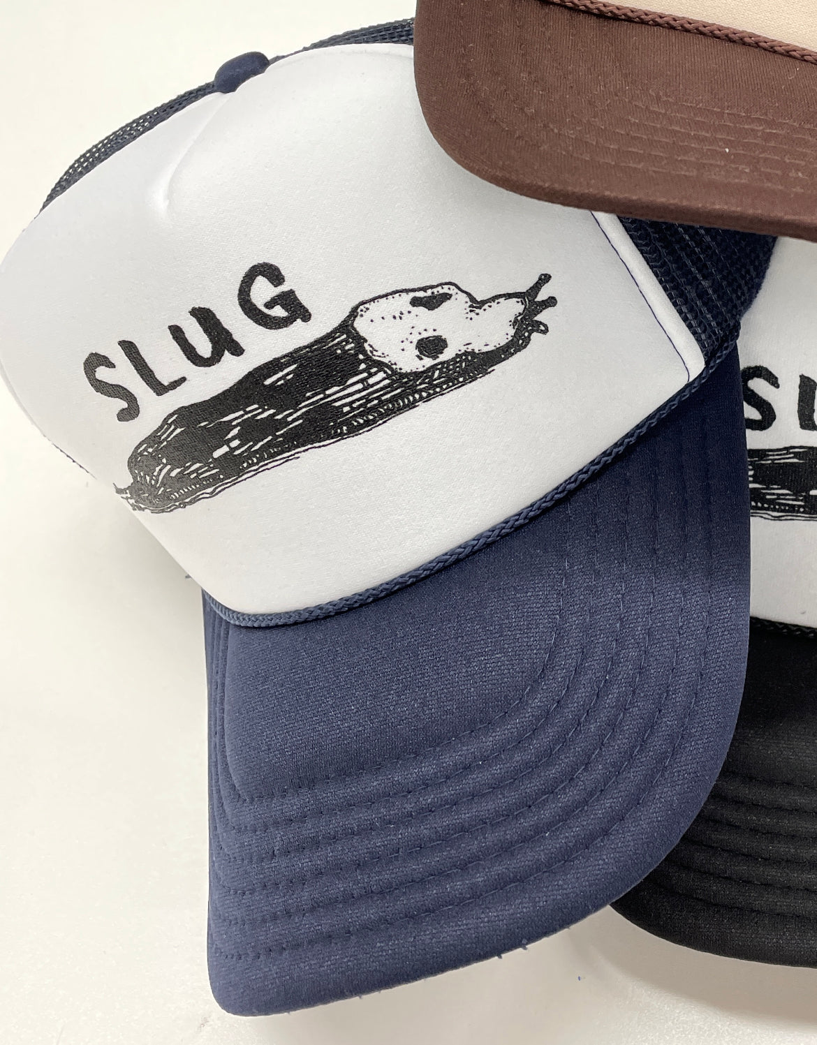 This is our Slug design, printed in black ink on a variety of mesh trucker caps.