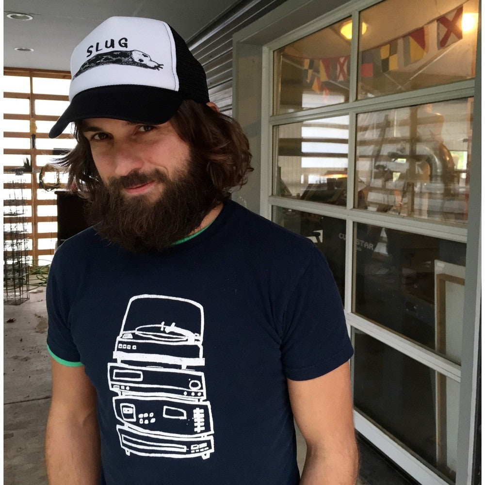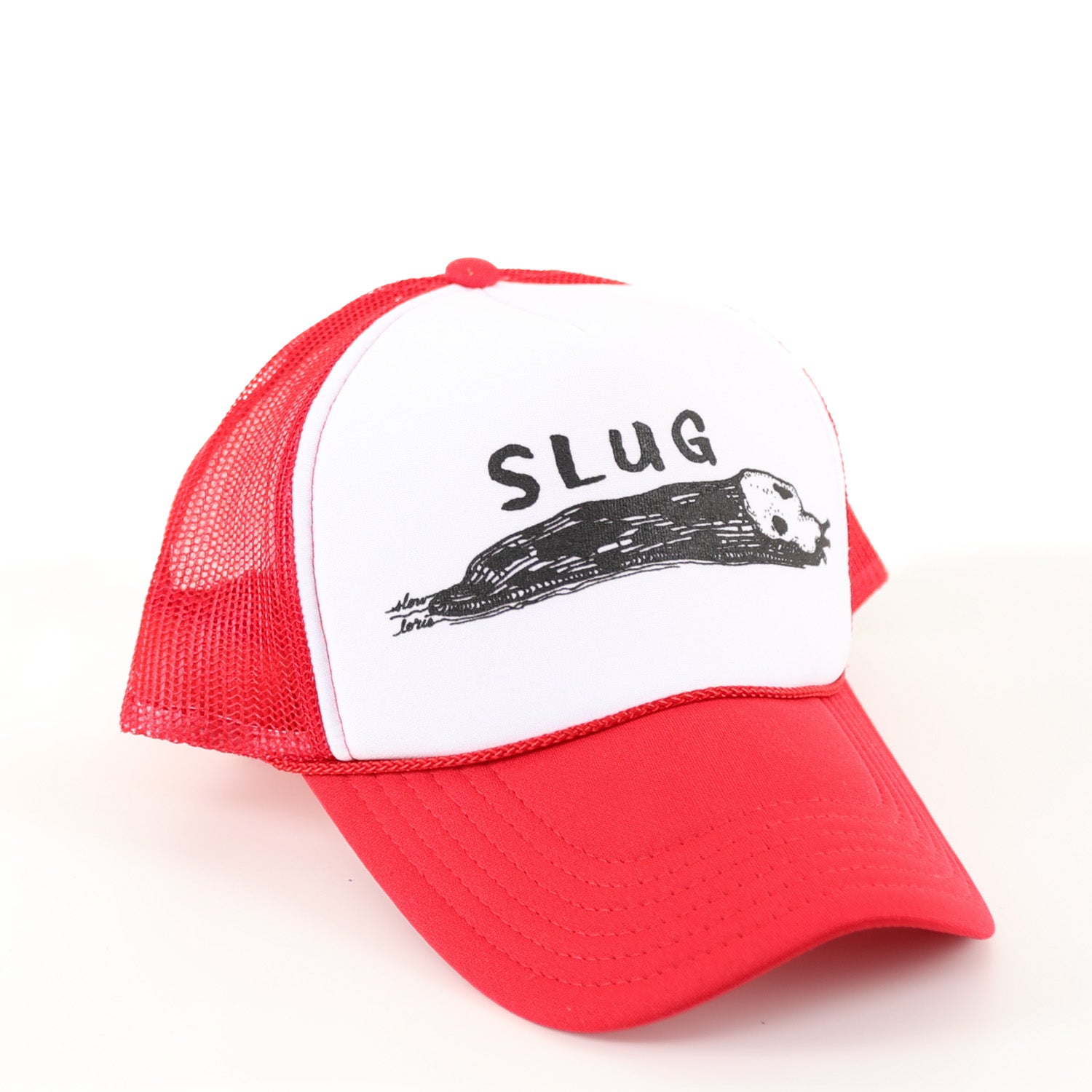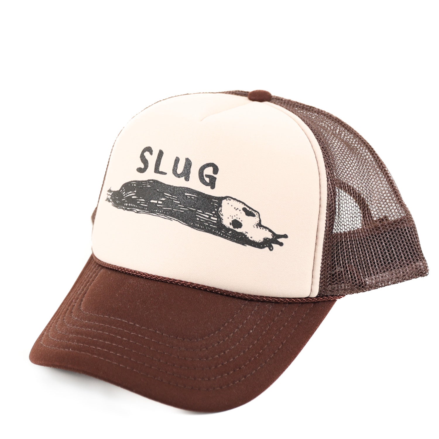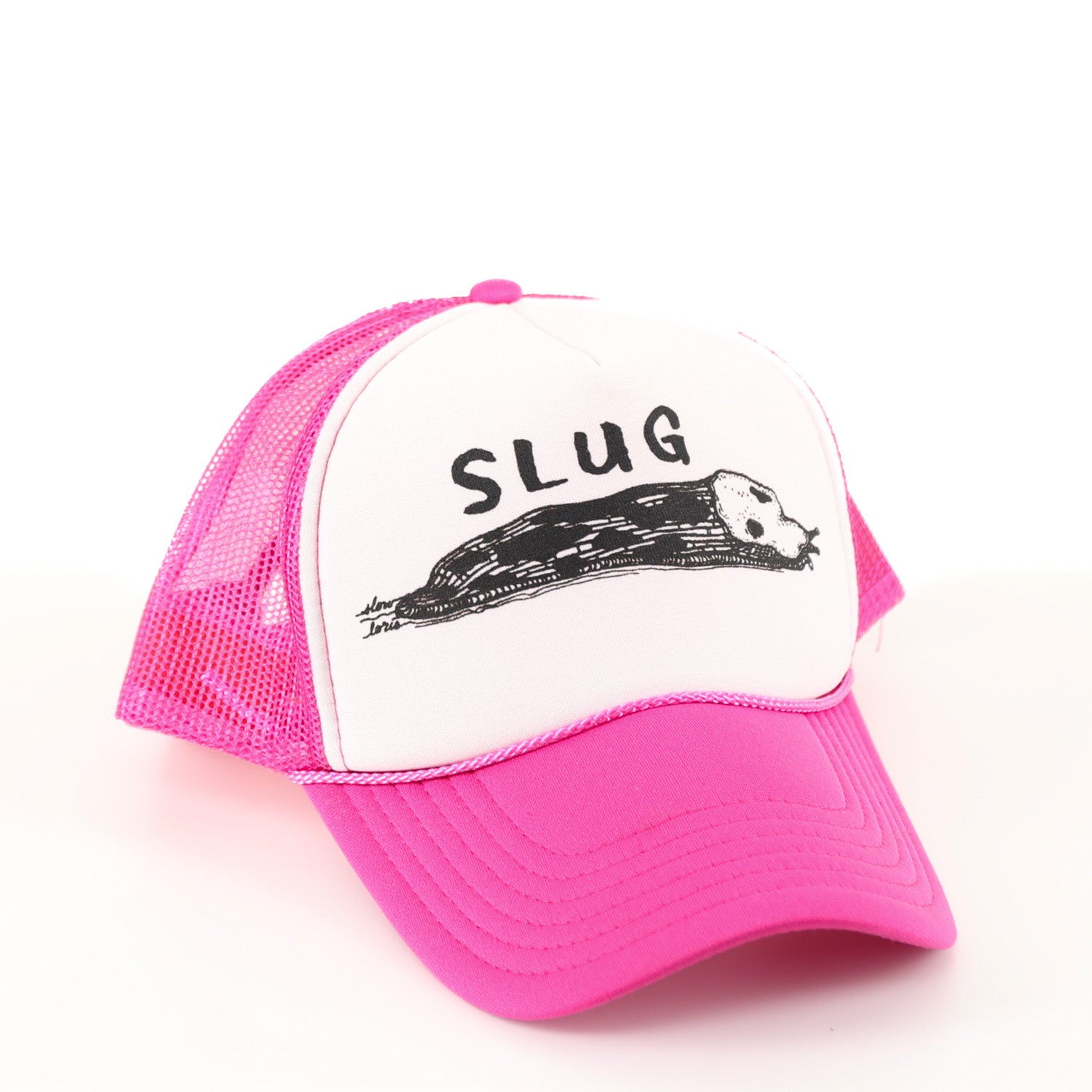 This is our Slug design, printed in black ink on a variety of mesh trucker caps.