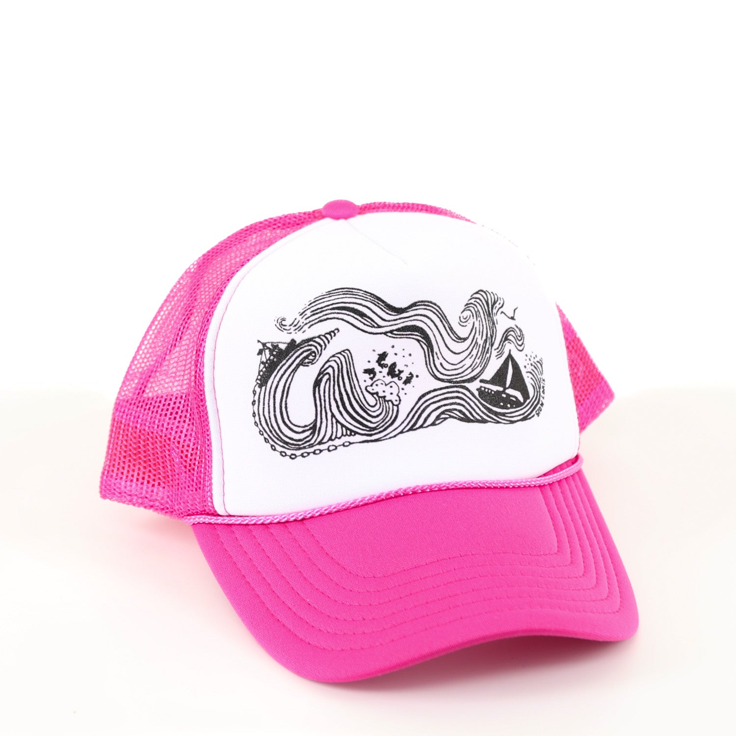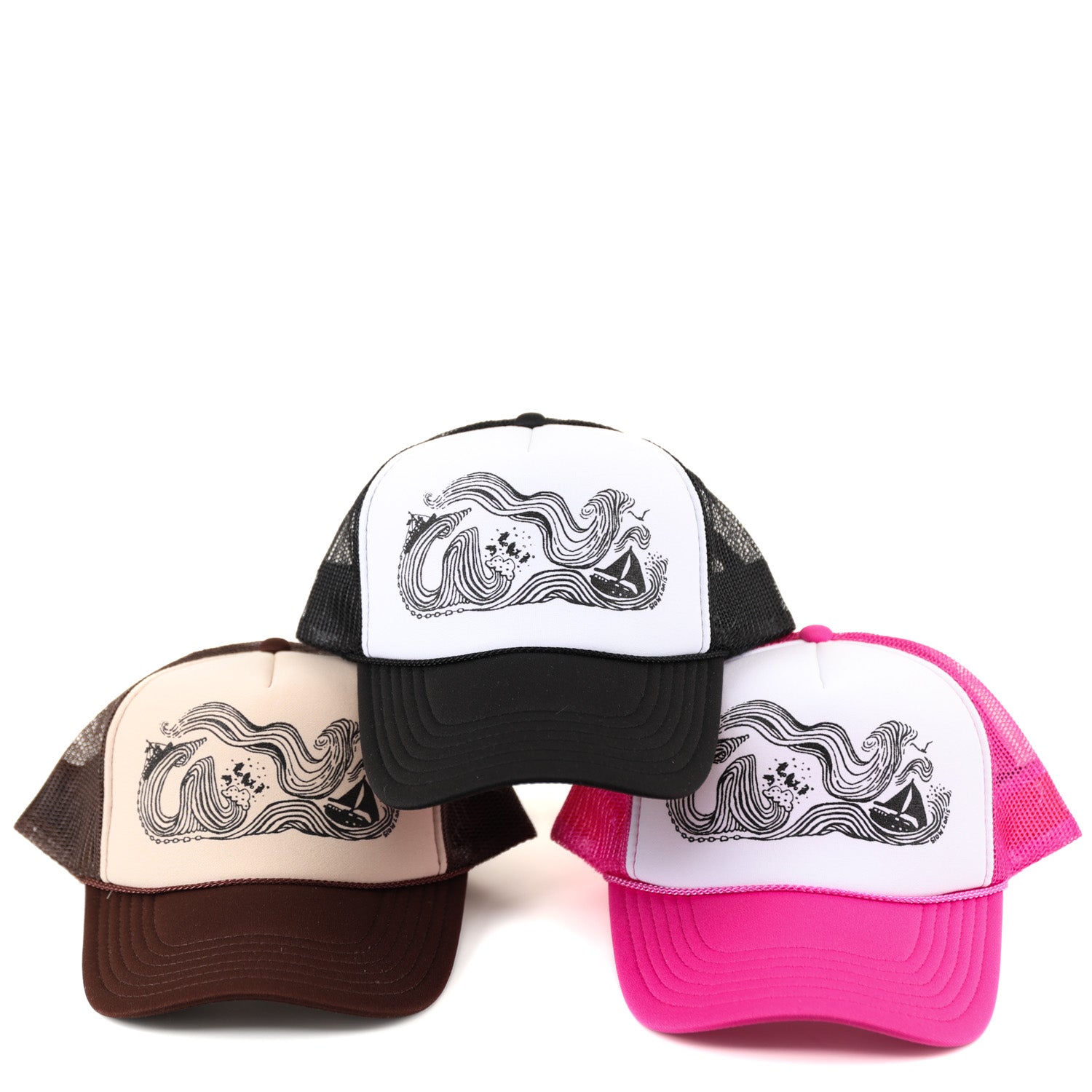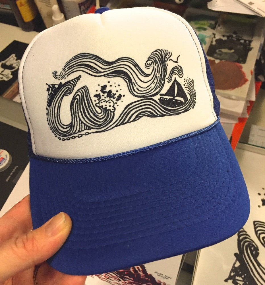 This is our Wind & Sea design, printed in a variety of ink colors on a variety of mesh trucker caps.