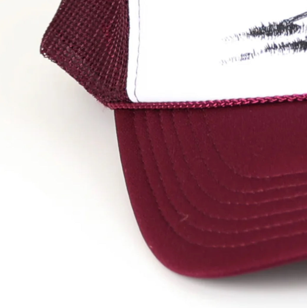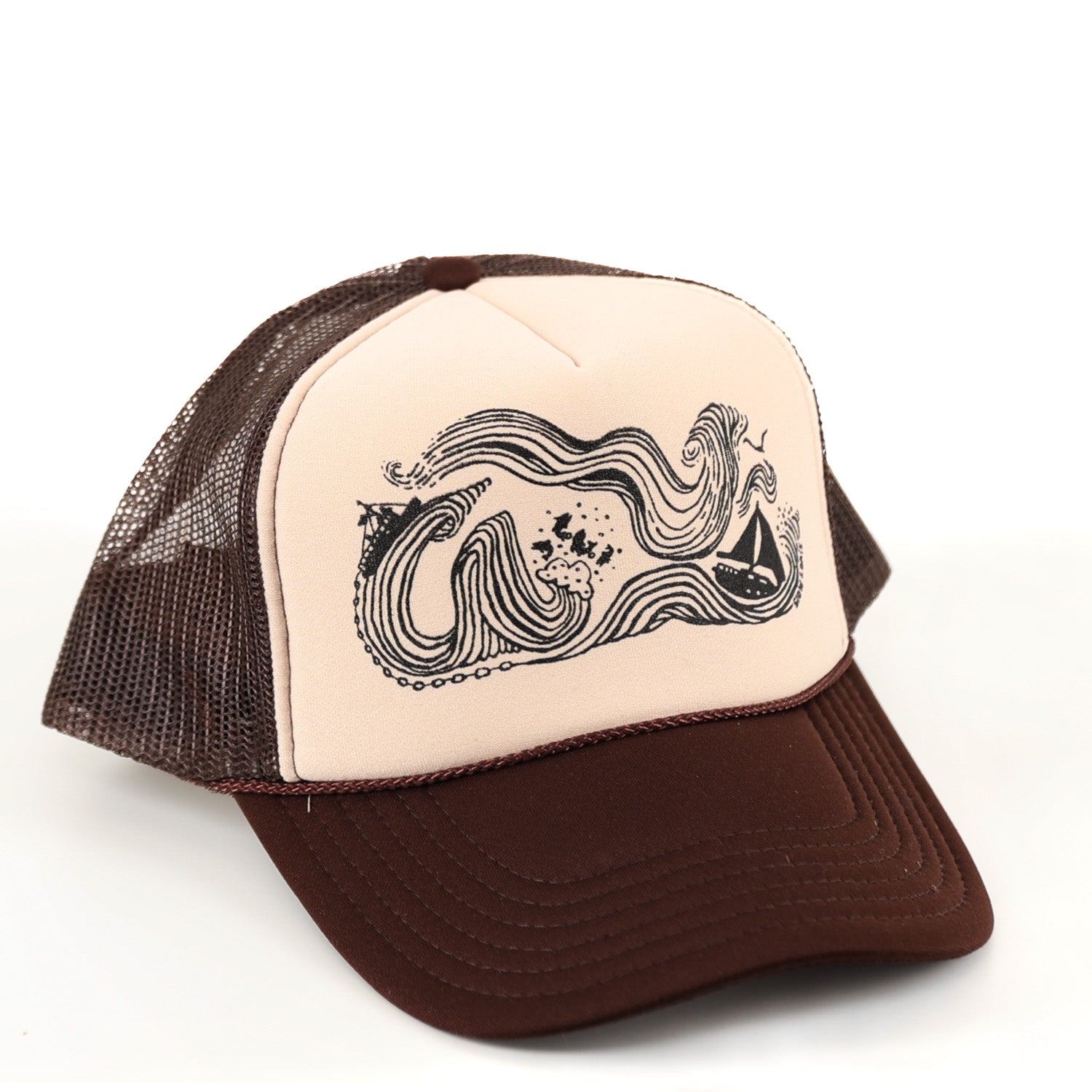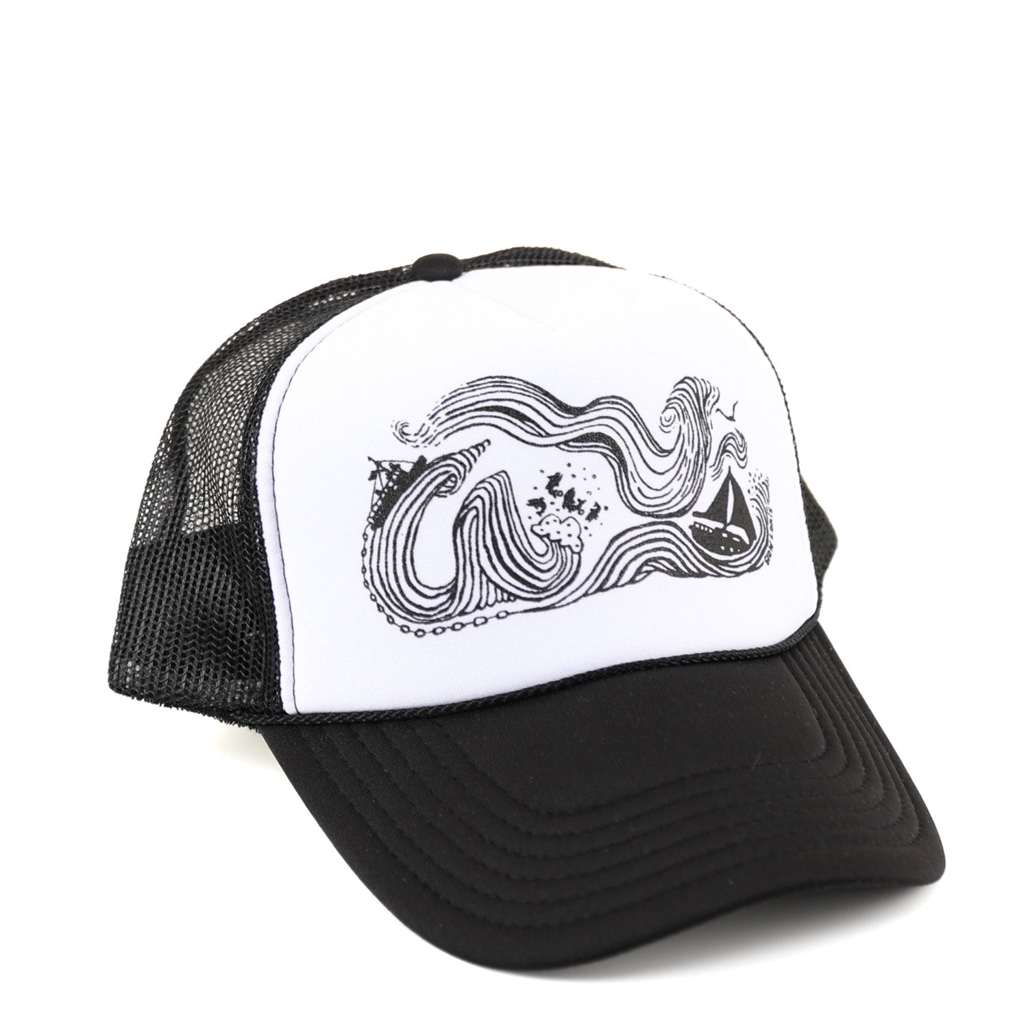 This is our Wind & Sea design, printed in a variety of ink colors on a variety of mesh trucker caps.