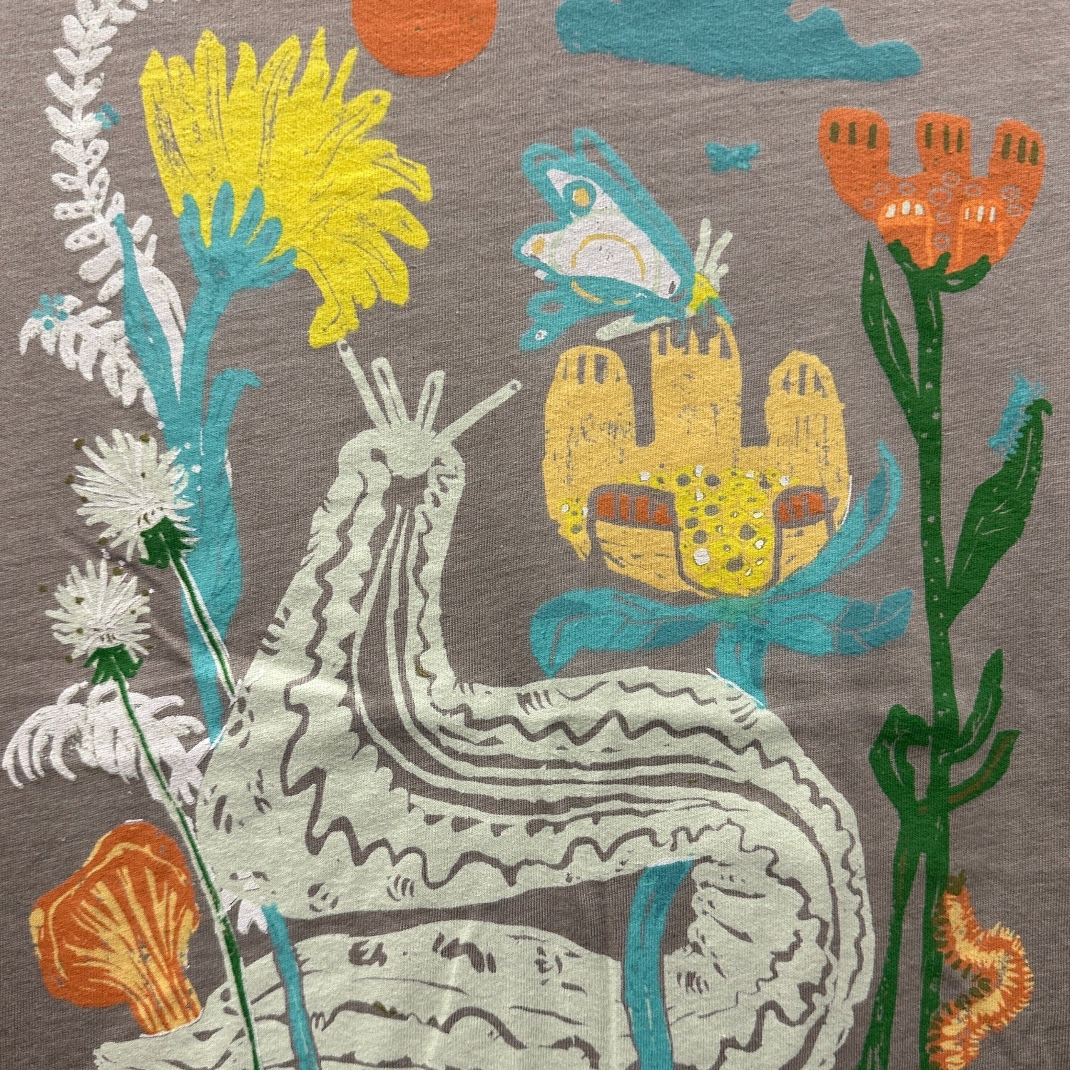 The slow roamers - slug, butterfly, and caterpillar - are printed in vibrant, chalky pastels that evoke a late summer's day.